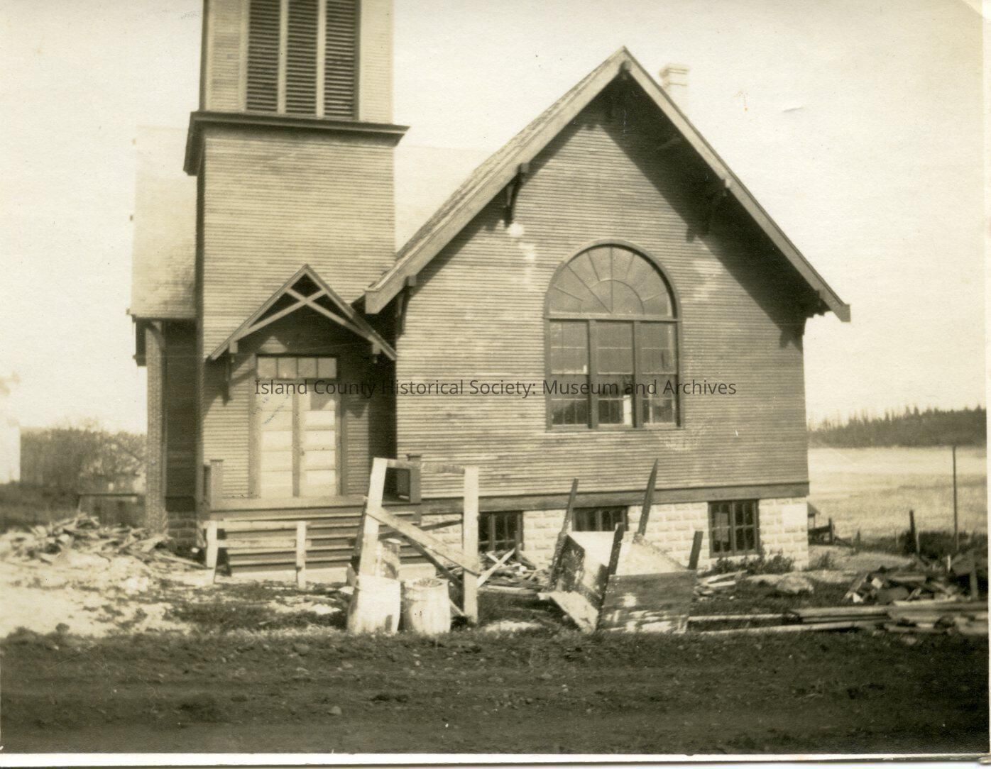 The Crescent Harbor Methodist Church. The foreground is littered with furniture and building supplies which might indicate it is around the time of construction. The building itself looks in good shape and complete. The back of the photo reads, "M.E. Church, Paul Allen."Made/Created