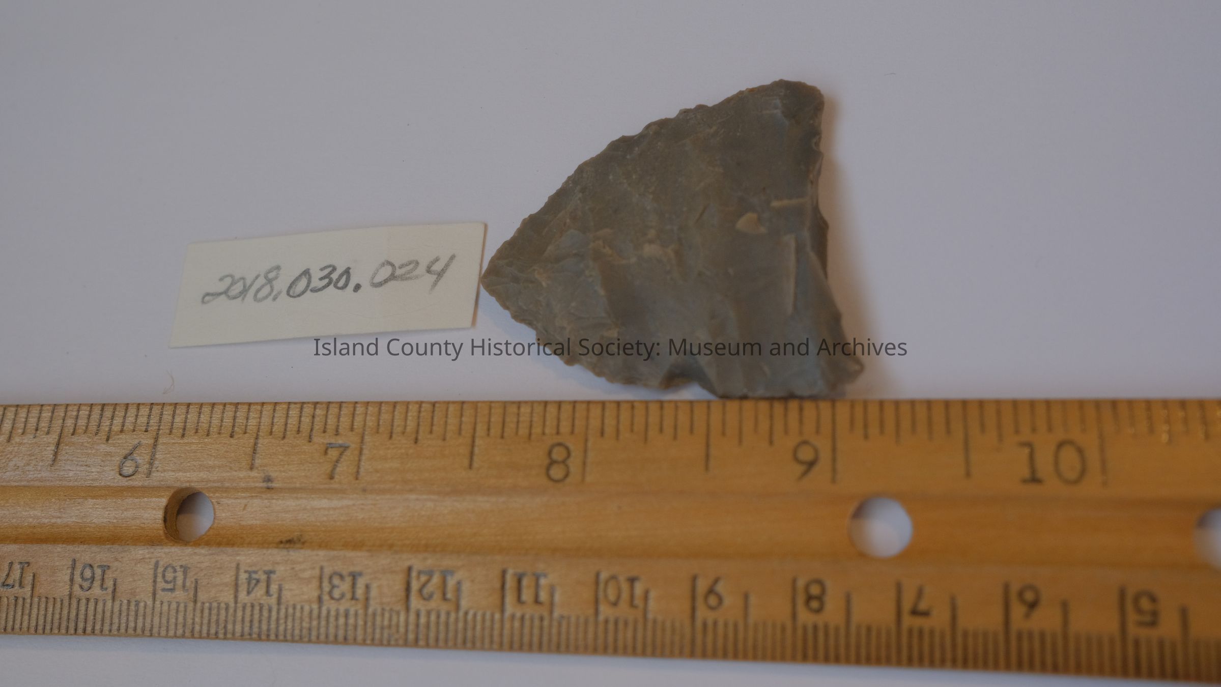 Medium gray, hard stone projectile. Base is missing. Tip is good, sharp. Notch in one side about halfway on one side.