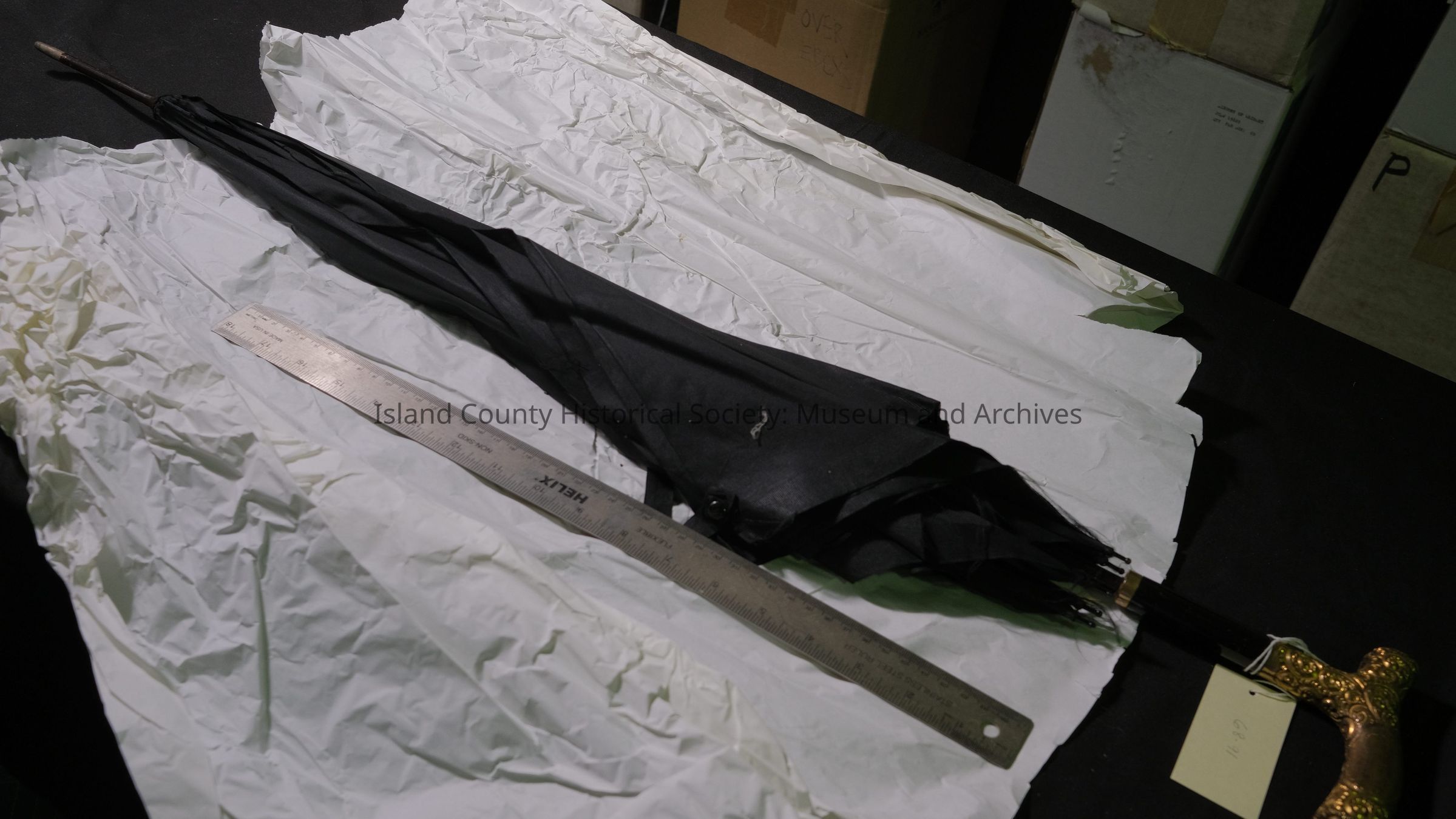 Gold handled black silk parasol. M. D. Wolfe '07. Owned by Mrs. Hunziker's mother.