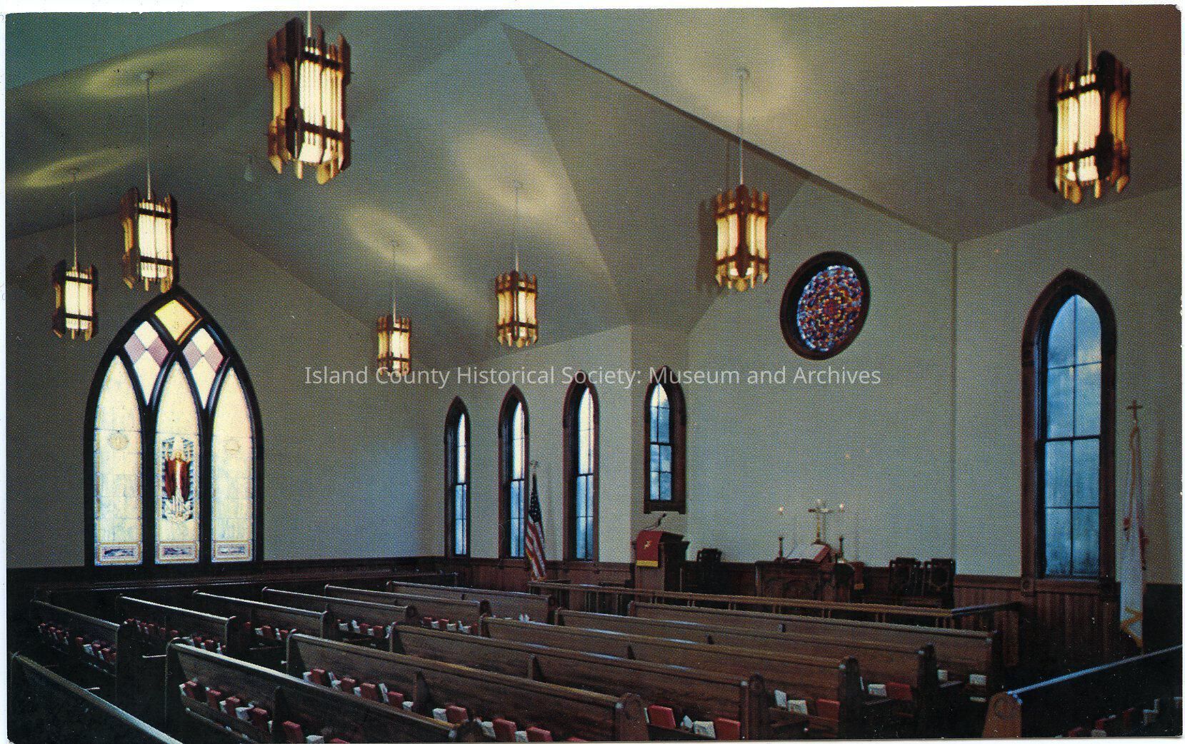 Postcards of the interior of a church. White walls, hanging lights, round stained glass window, arched windows, pews. On the back: sanctuary of Coupeville United Methodist Church, established 1853, Coupeville, Wn. On Whidbey Island.