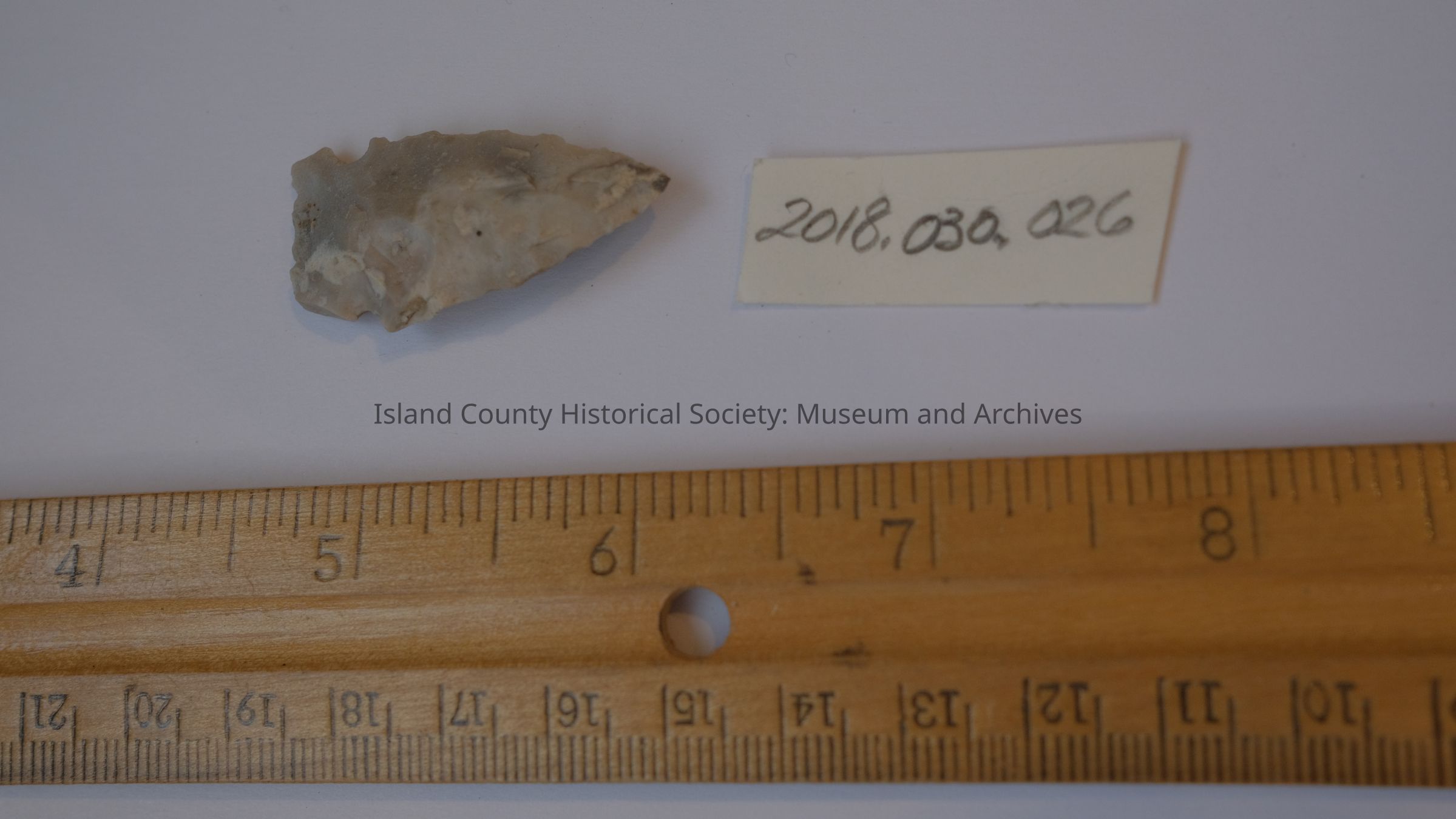 Tan, hard stone projectile. Small. Straight base, side notched. One side of base is missing. Tip is good.