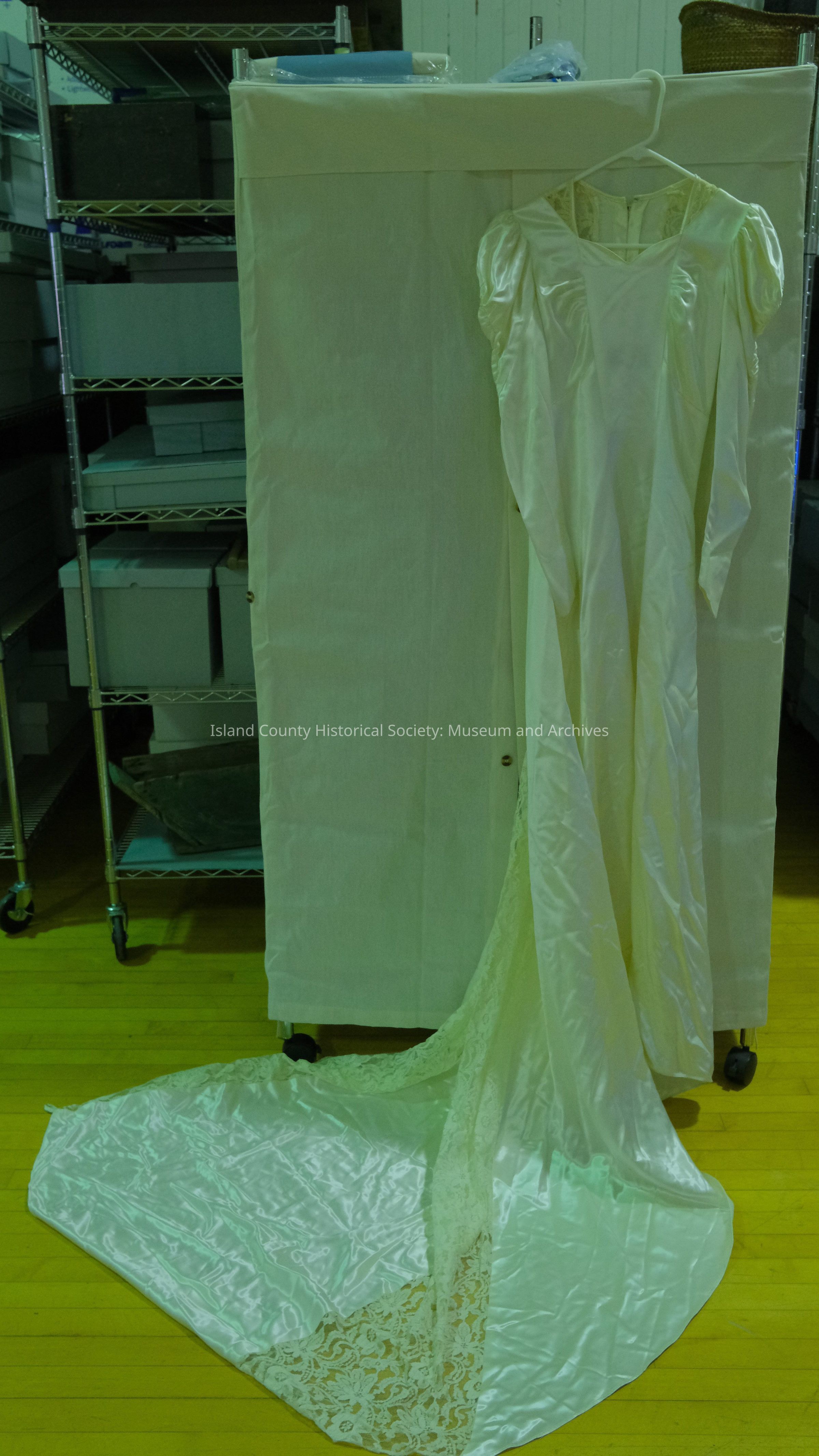 Dress and coat. Wedding dress - ivory satin with train and lace insets - Mrs. Francis Otto's, June 14, 1940. Wedding dress -ivory brocade with pink and green with beige crepe blouse sleeves - 2 pieces. Wedding dress - ivory brocade with flowers. Dress with sheer sleeves (A). Sleeveless coat (redingote) (B).