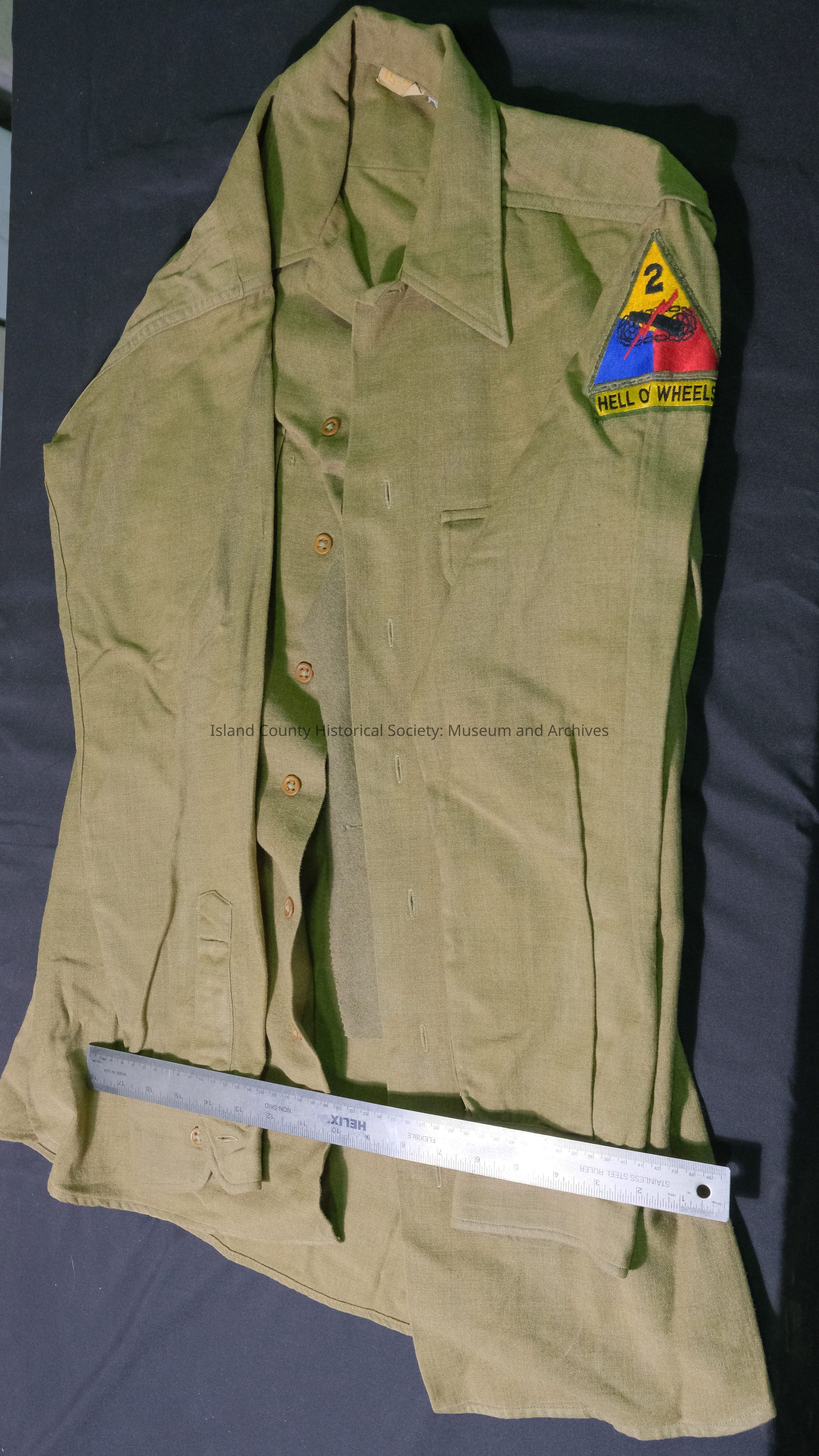 Shirt, World War II, olive drab wool. Emblem - "Hell on Wheels" on sleeve, no stripes. Size 15-34
