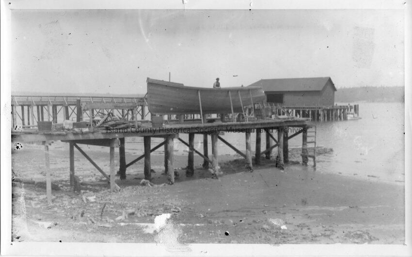 A boat being built on a dock next to a larger wharf. There is a small boat tied up to the wharf in the back ground. A man is working on the boat in the foreground. It appears to be a smaller boat. Possible that it is the Lovejoy boat builders in Coupeville.