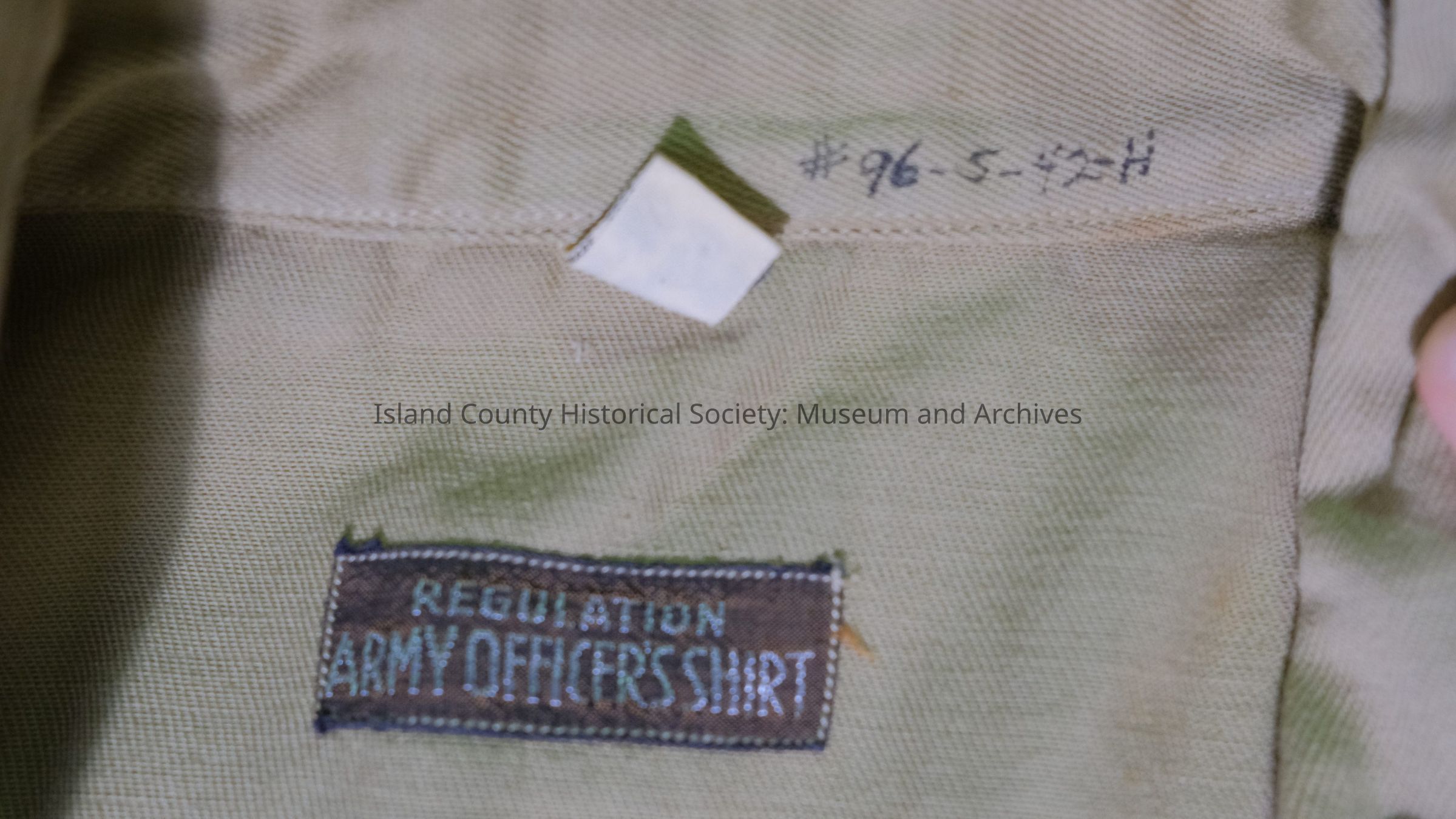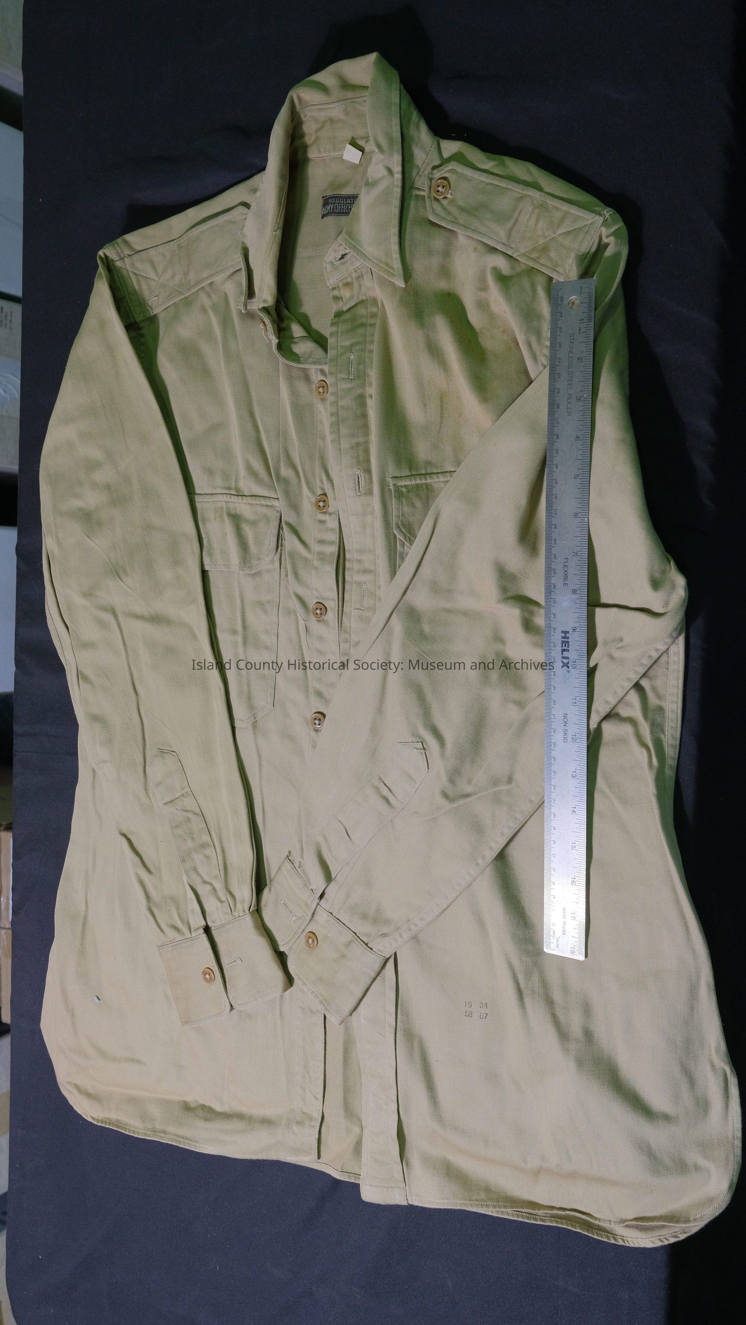 Shirt, World War II, khaki cotton twill, size 15-34. Tag on back of shirt: "Regulation Army Officers' Shirt"