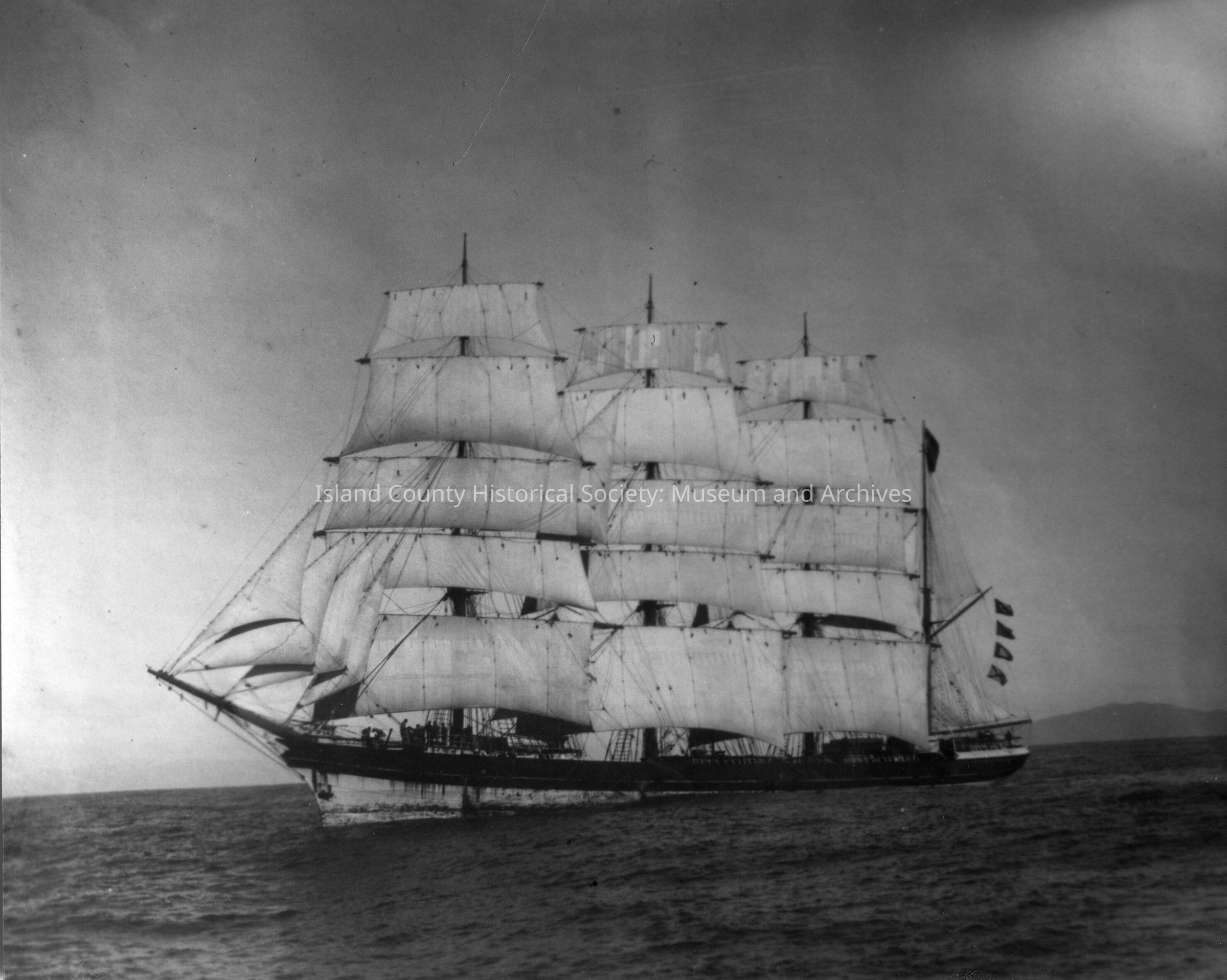 A three masted square rigged ship. There are four nautical flagsoff the stern. A group of sailors can be seen on the foredeck. A low moountain is seen in the right background. The sailing ship appears to be carrying logs. Back reads: "From Lillian Huffstetler"