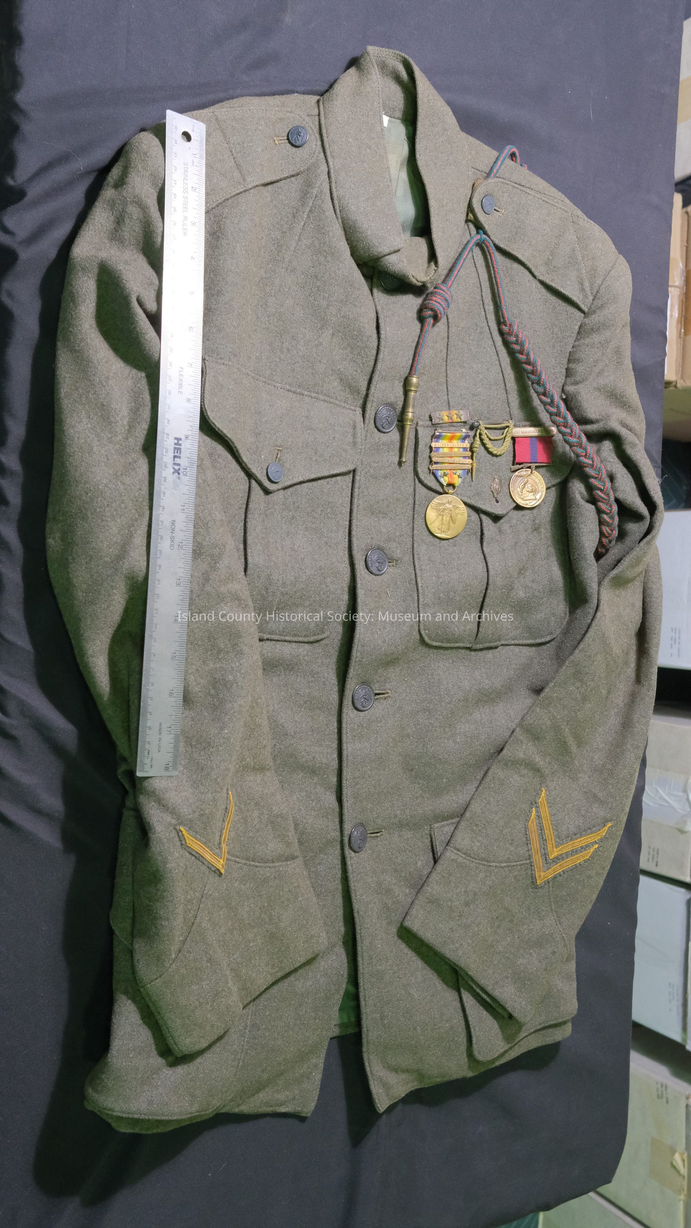 Jacket, World War I. Olive drab wool - long - U. S. Marines, with cord and 1 stripe and medals: