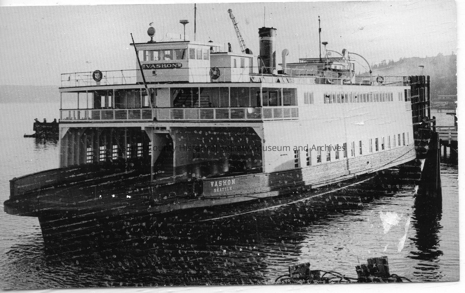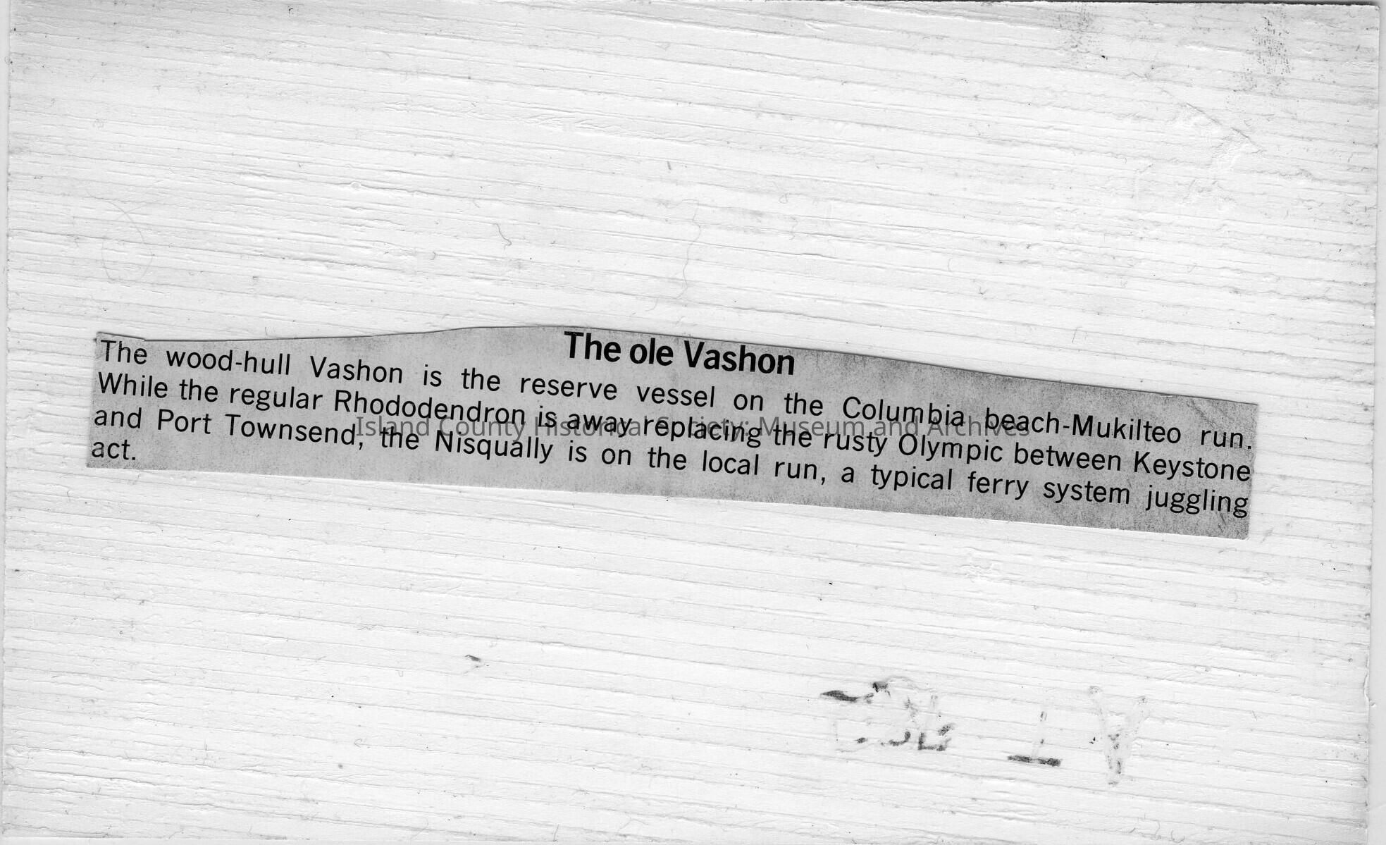 Vashon Seattle reserve ferry is moored to the pier. The ferry is three decks with no cars on board. The ferry is white from the main deck and above, colored main deck to the water line. The pier is to the right in the photo. On back " The ole Vashon: The wood-hull Vashon is the reserve vessel on the Columbia beach-Mukilteo run. While the regular Rhododendron is away replacing the rusty Olympic between Keystone and Port Townsend, the Nisqually is on the local run, a typical ferry system juggling act."