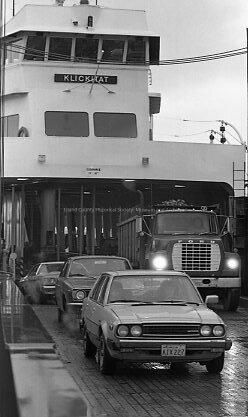 Cars and a truck leaving the Klickitat ferry.Made/Created