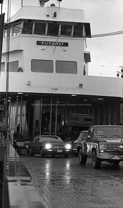 Cars and a pickup truck leaving the Klickitat ferry.Made/Created