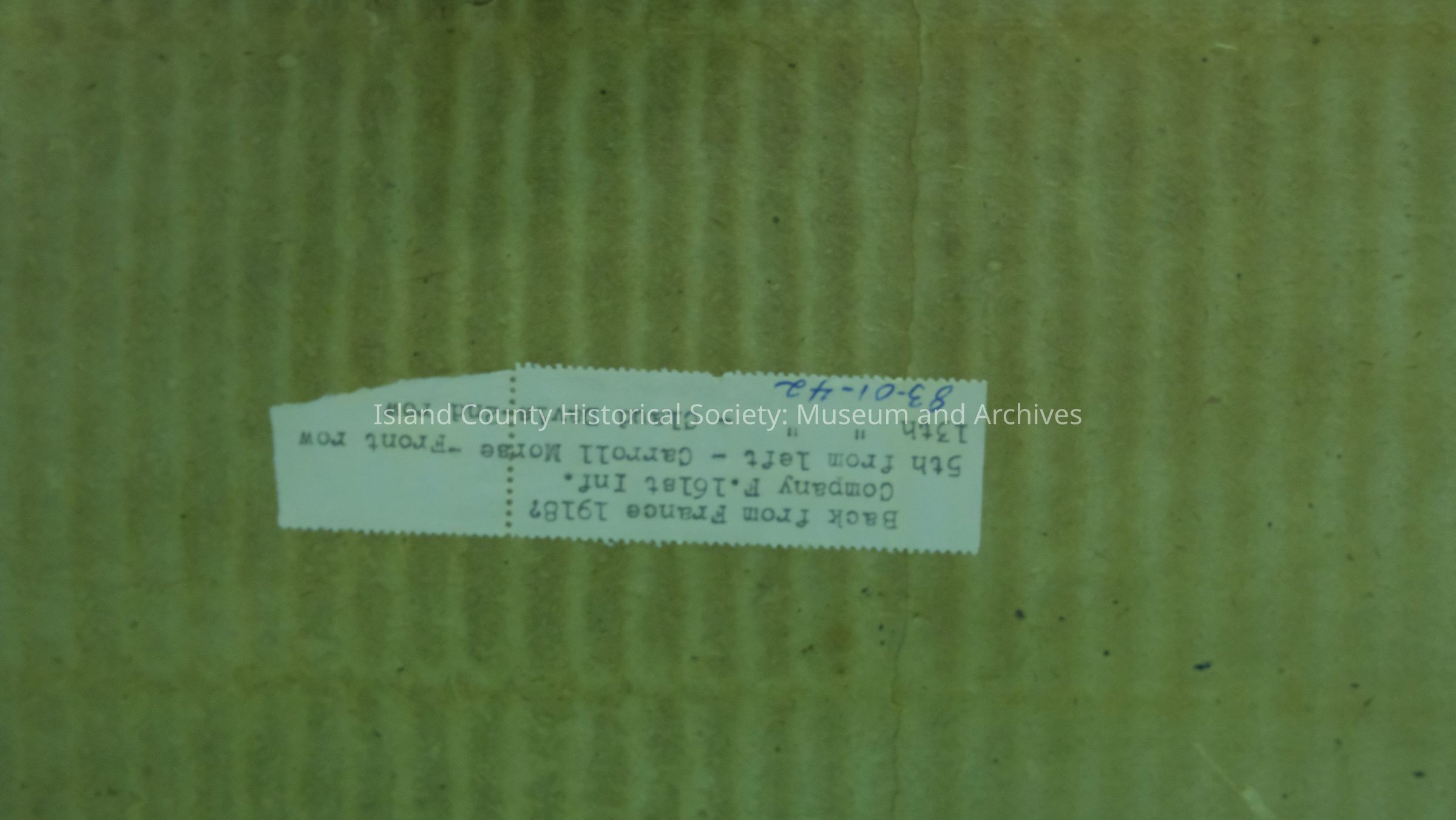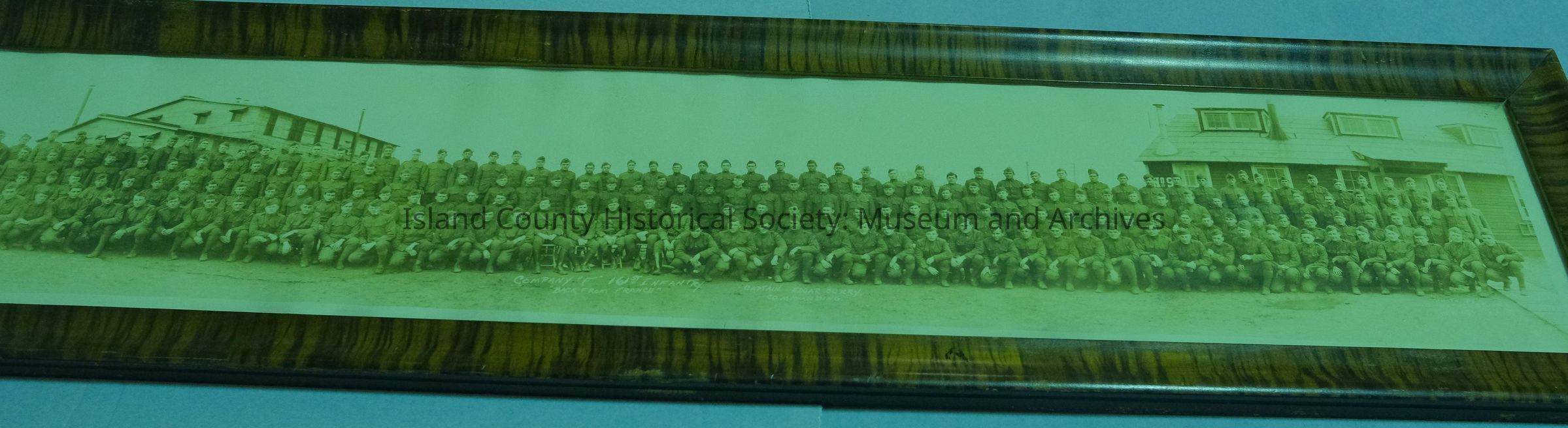 sepia framed photograph titled "Back from France 1918"; Company F, 161st Infantry, 5th from left, front row - Carroll Morse, 13th from left, 2nd row - Claud Davis