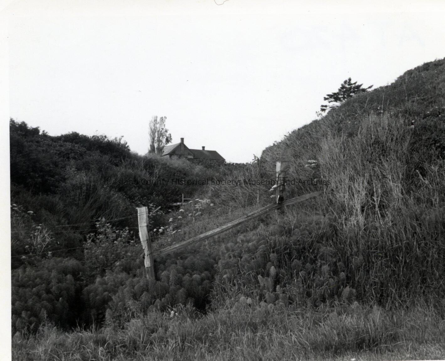 Black and white photo. On reverse, caption reads: Ferry House from beach. The Ferry House is seen at the top of a gulley overgrown with grass and vegetation. That gulley in the foreground, left of the split rail fence is where ferry passengers would ride or walk to the Ferry House after landing. The house looks to be made long before the picture was. The view is from Hill Road, near Ebey's Landing State Park.Lexicon