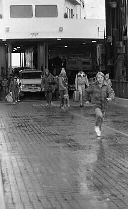 Men, women, a boy and a dog leaving the Klickitat ferry.Made/Created