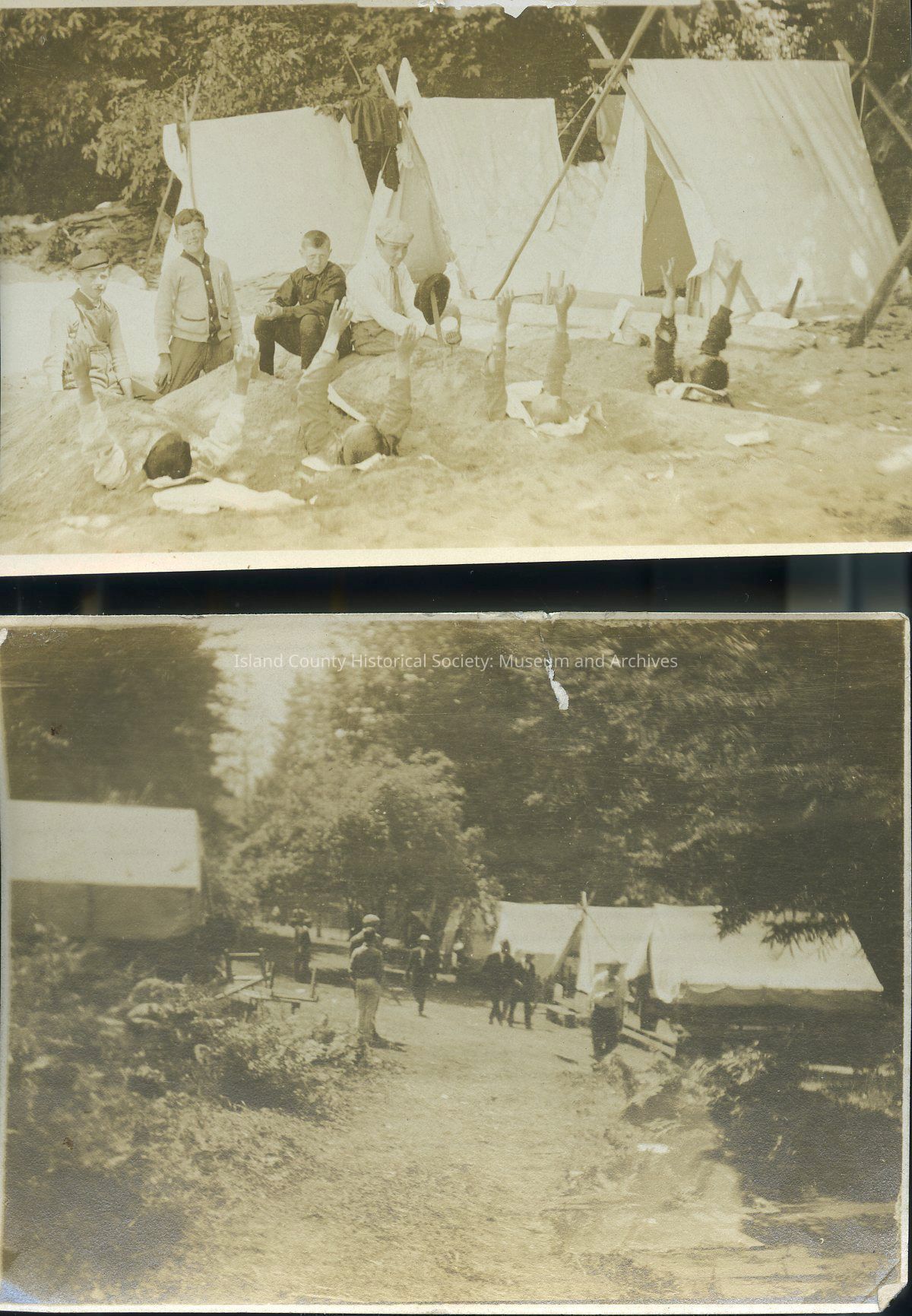 two sepia photos of the Everett YMCA Boys Camp held at Maxwelton, Whidbey Island, WA - 1910Photograph Details