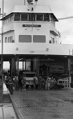 Cars and trucks on the ferry, men, women, a boy and a dog leaving the Klickitat ferry.Made/Created