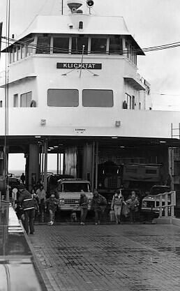 Cars and trucks on the ferry, men, women, a boy and a dog leaving the Klickitat ferry.Made/Created