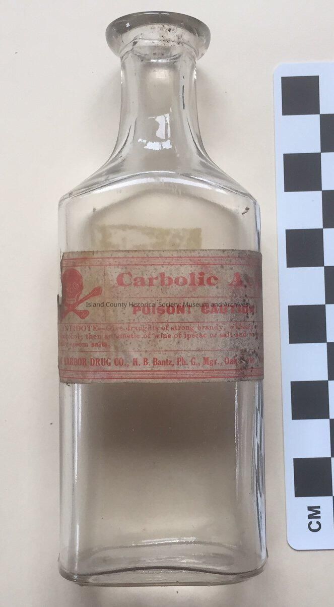 Small glass drug bottle, rectangular. Label is white with red lettering, discolored: [skull & crossbones image, Carbolic Acid, Poison! Caution! Antidote - Give draughts of strong brandy, whiskey, or diluted alcohol; then an emetic of wine of ipacac or salt and water and finally epsom salts. Oak Harbor Drug Co., H.B. Bantz, Ph.G., Mgr., Oak Harbor, Wash.