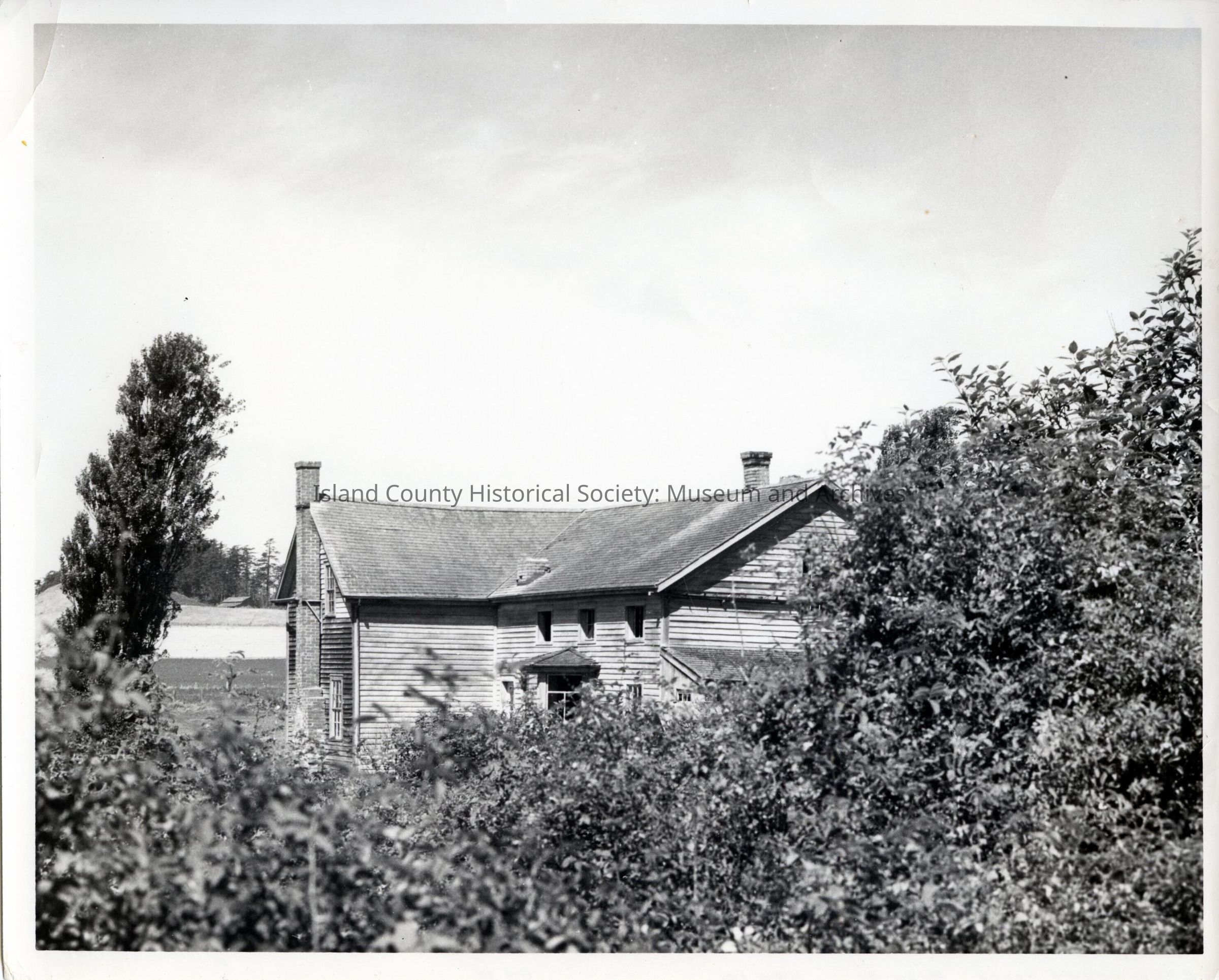 Black and white photo of the Ferry House from the rear, and facing across Ebey's Prairie. The Puget Sound is to the left and Coupeville is to the right. Restoration work on the leftIn the distance, one can see a sheep barn across Ebey's Prairie, between the house and the tree on the left. The left side of the house faces the Puget Sound. Caption on reverse reads: Ebey - Ferry House 8-20-71.