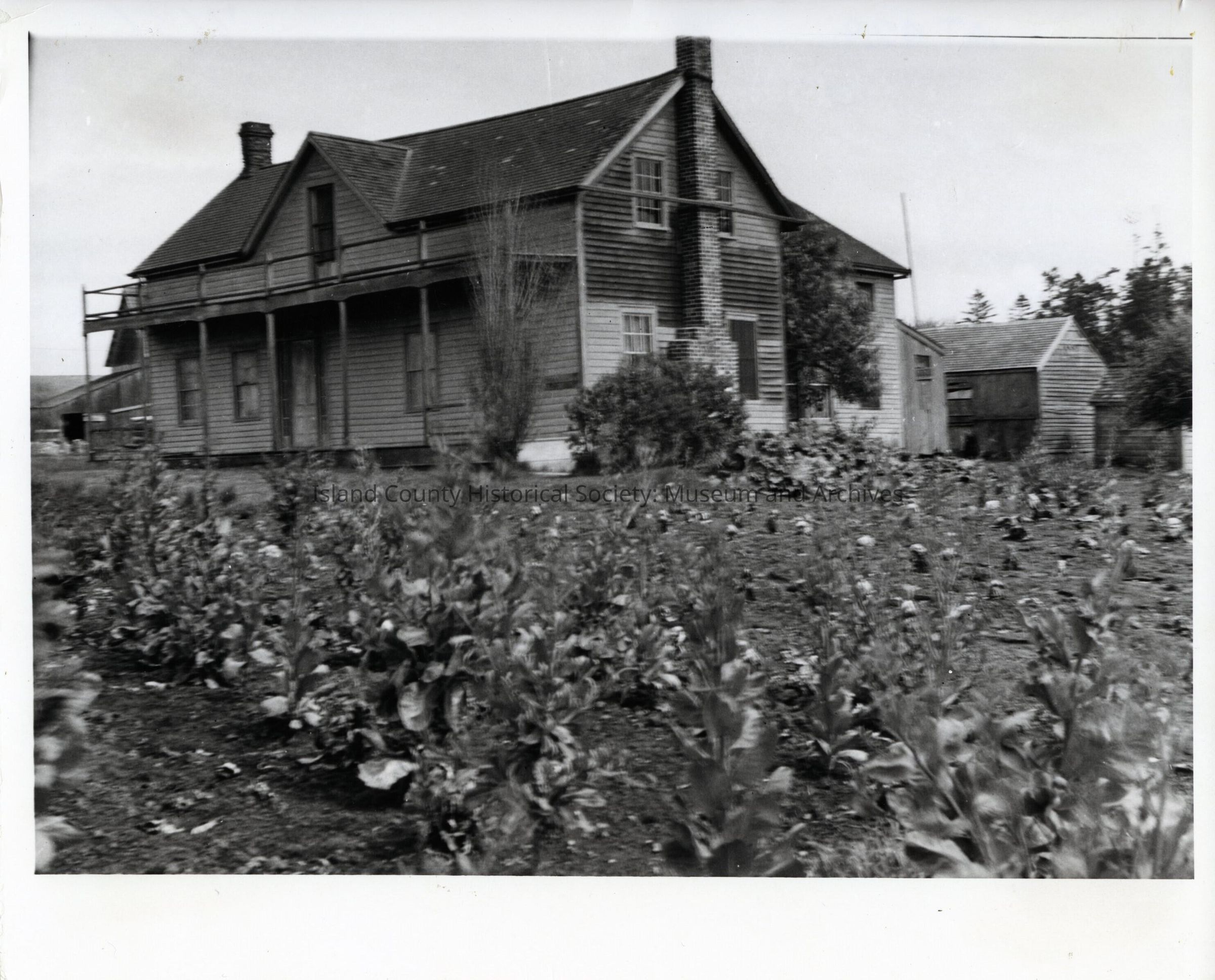 Caption on reverse reads: Ferry House Ebey Landing N.W. view 1937. and Courtesy Library of Congress. Black and white photo of the Ferry House from the front. The upper deck is added more recently. A barn is just visible at the left beyond the Ferry House. On the right side of the photo one can see the rear of the house and a couple of outbuildings as well. Port Townsend and the Puget Sound are to the right in this view.