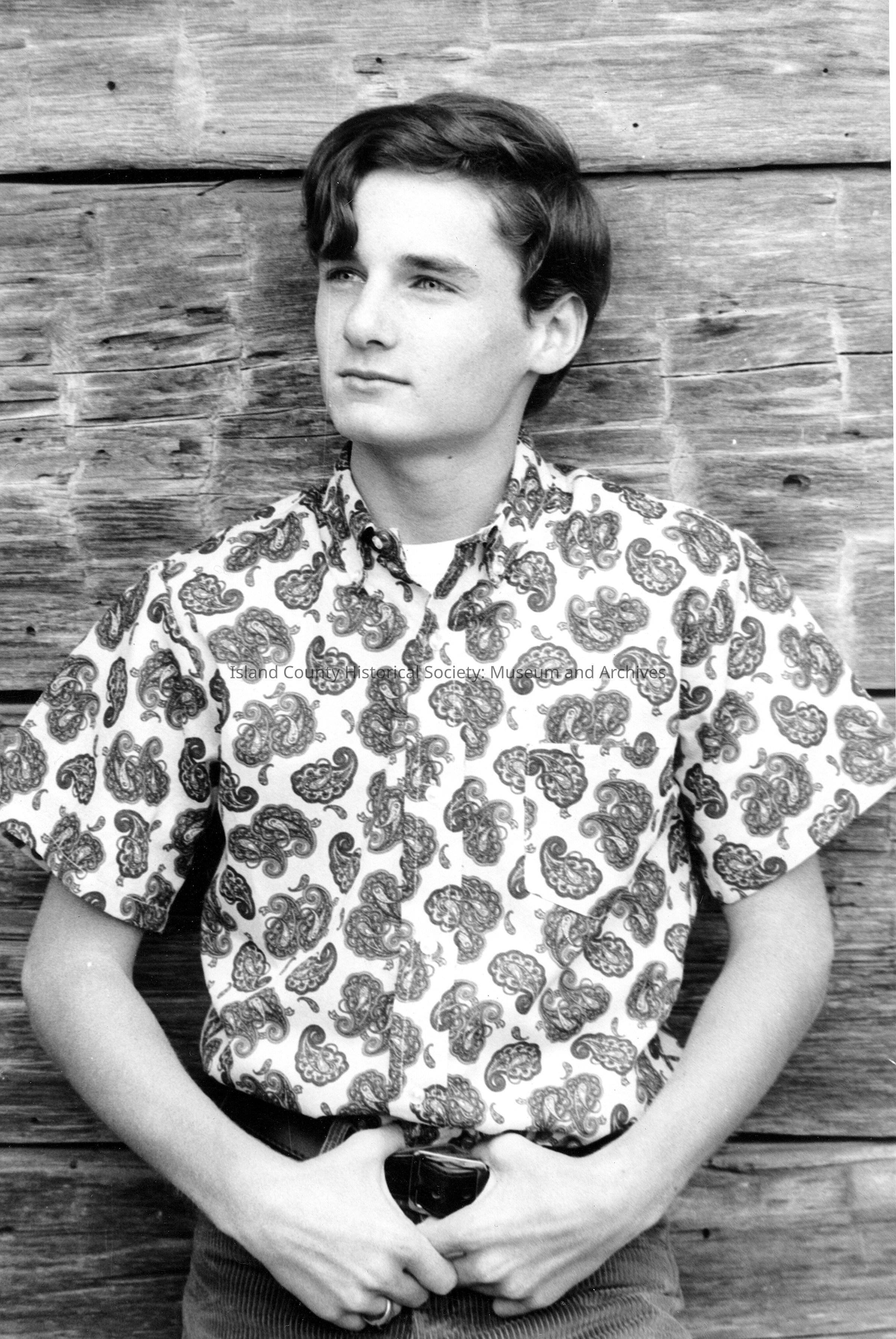 Young man in front of blockhouse Cropped version (2003-11.0011a) entitled "Boy" was displayed in Funk's photo show September 1976 at the Anacortes Museum of History and Art.