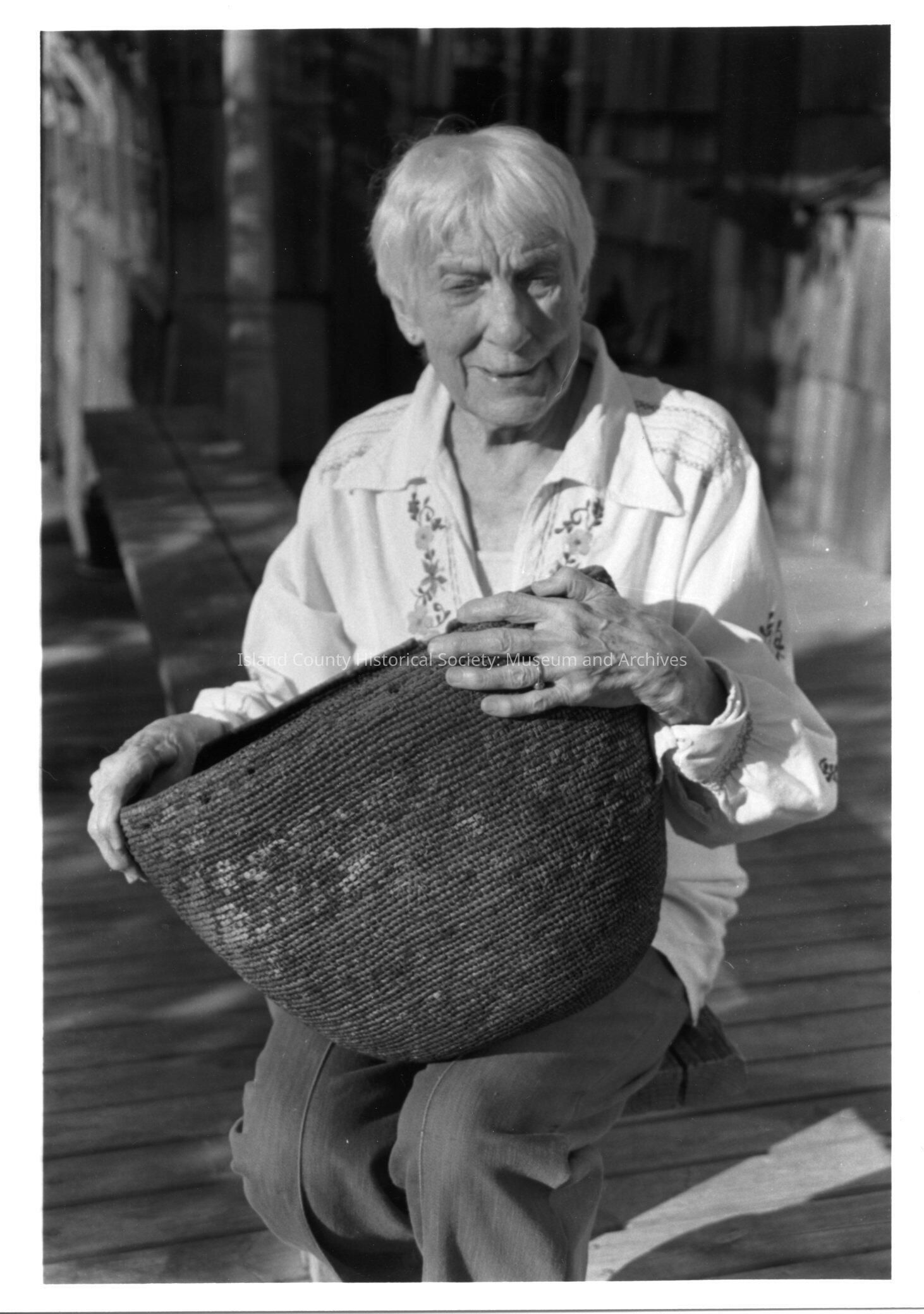 Black and white photo of an older woman in a light shirt with flowers embroidered on it and maybe gray or light colored trousers. She is sitting on a long wood bench on a deck and is holding a large woven basket. On the back: Mary Fullington