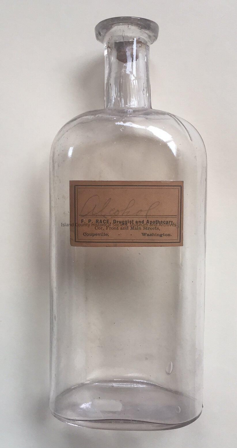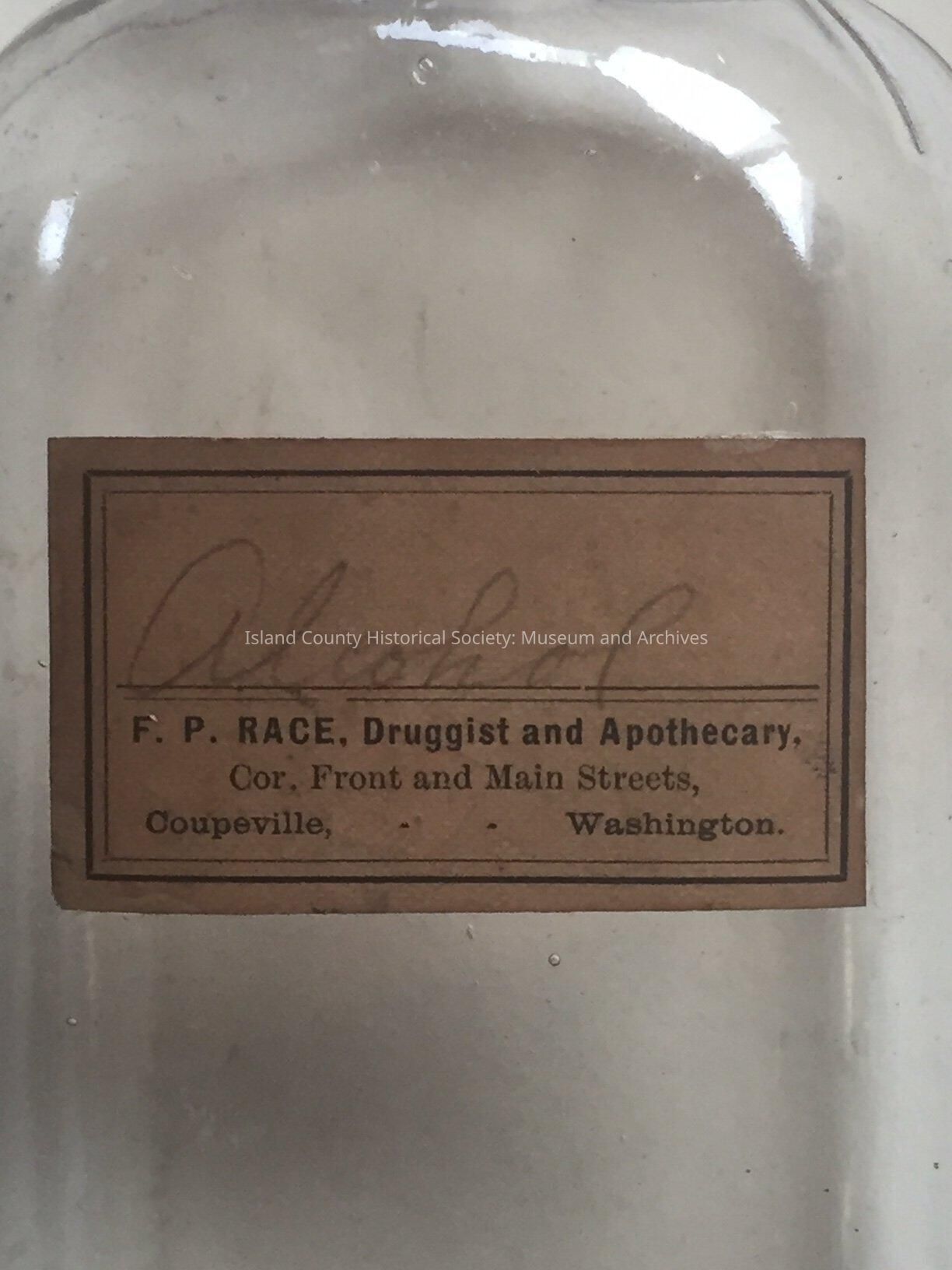 Clear glass oval diam bottle with broken cork stopper. Paper label is discolored: F.P. Race, Druggist & Apothecary, Cor, Front and Main Streets, Coupeville, Washington. Also handwritten: Alcohol.