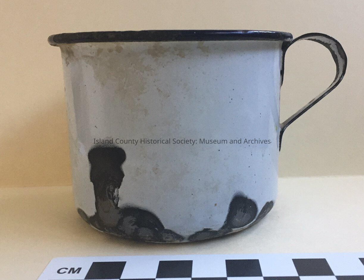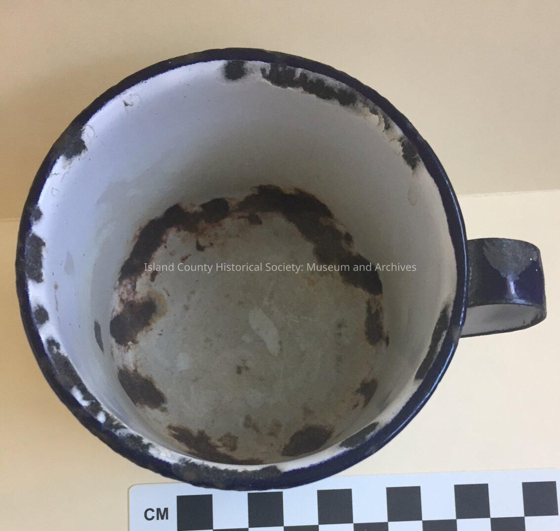 Tin cup, blue with white enamel. Cipped around rim, base, handle, and inside bottom.