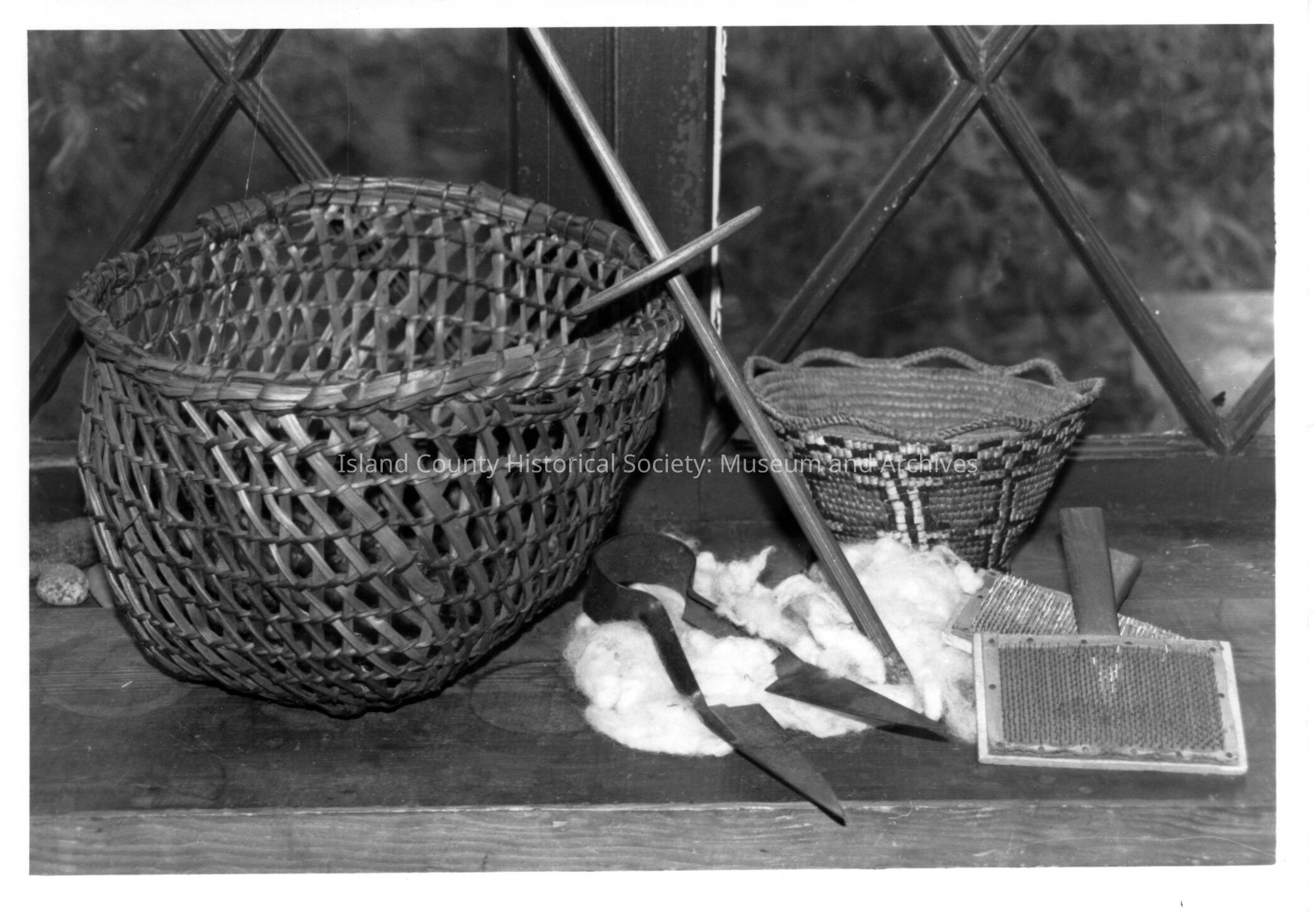 Black and white photo of two woven baskets, weaving materials and tools sitting on a windowsill. One tool is old sheep shearing scissors, another are two wool carders. A handful of wool is with the tools. On the back: woven baskets at Mary Fullington's