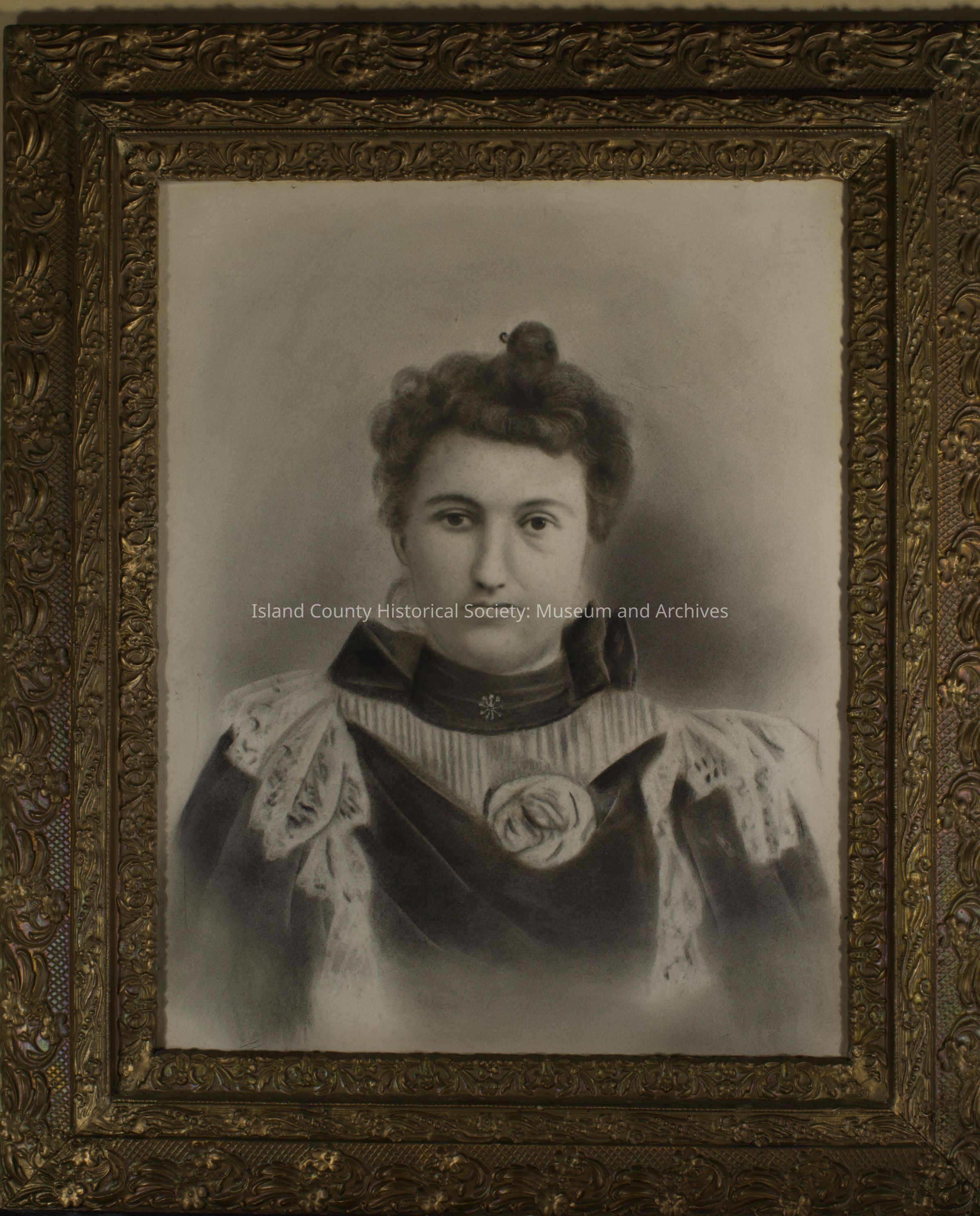 26 1/2 x 22 w framed portrait of Effie Capaan. The frame is bronze in color with ornate leaves and flower carvings. The picture looks like it was hand drawn and black and gray in color. The drawing was taken from a LaRoche family photo with the object id 2020.019.002.Made/Created