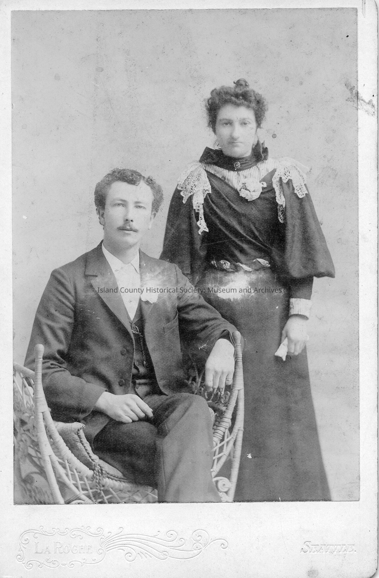 This is a portrait of Effie and Jacob K. Capaan. Jacob's brother was Coupeville's butcher. The photo is black and white and shows a man sitting in a wicker style chair and a woman (Effie) standing behind him. Effie is wearing a long formal dress with a flower broach attached to the neck piece. Jacob is wearing a dark suit with a flower on the left lapel. Effie's hair is tied up into a top knot.Made/Created