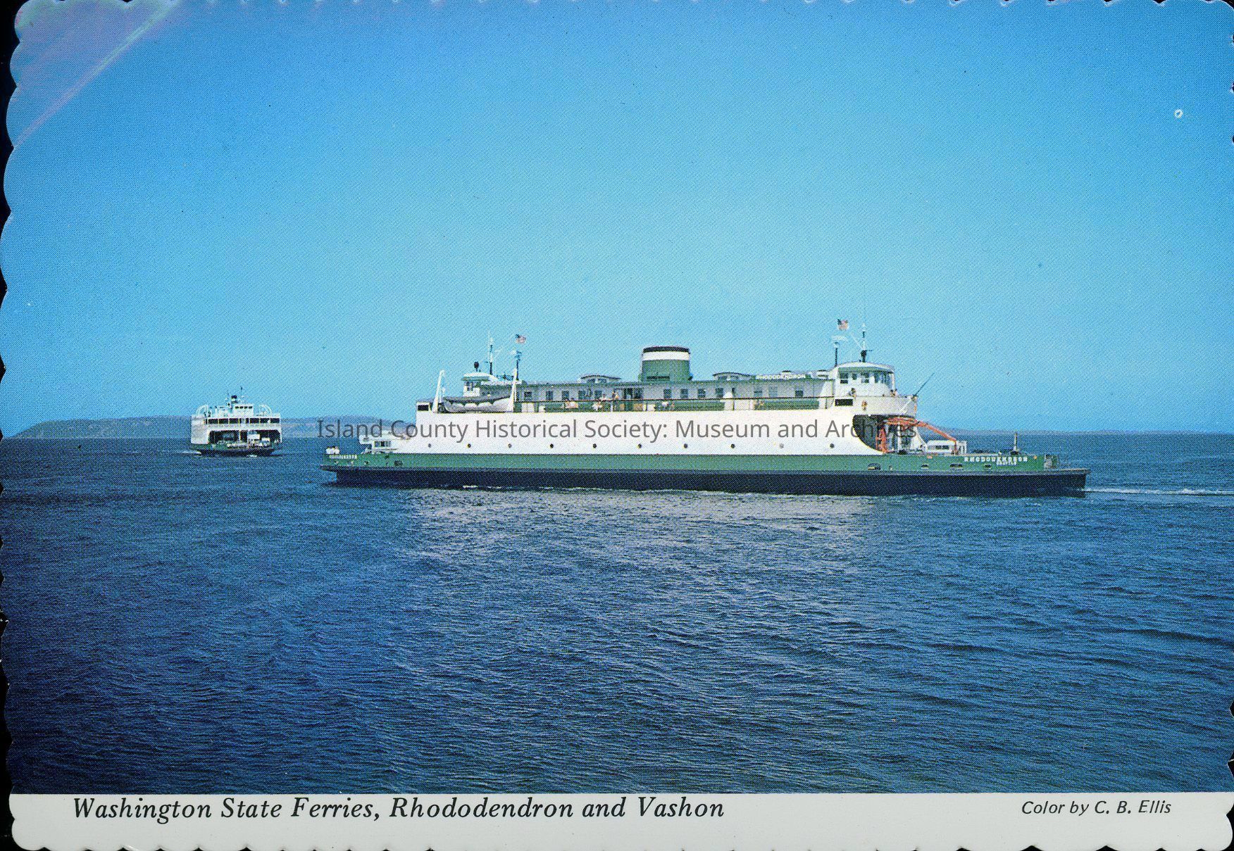 Postcard of Washington State Ferries "Rhododendron" (right) and "Vashon" (left). Descriptive text on reverse of postcard reads, "Washington State Ferries Rhododendron and Vashon. These ferries operate frequently between Mukilteo and Columbia Beach on Whidbey Island."Collection