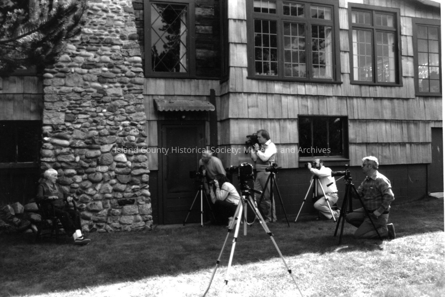 Black and white photo of a woman sitting on a chair outside next to a large stone chimney. The house has large windows on the 1st floor and doors and smaller window on ground level. The side is cedar shake shingled. This is the Fullington house. A group of 4 men and 1 woman are taking photos - with large cameras and lenses either handheld or on tripods. On the back: Photo focus class