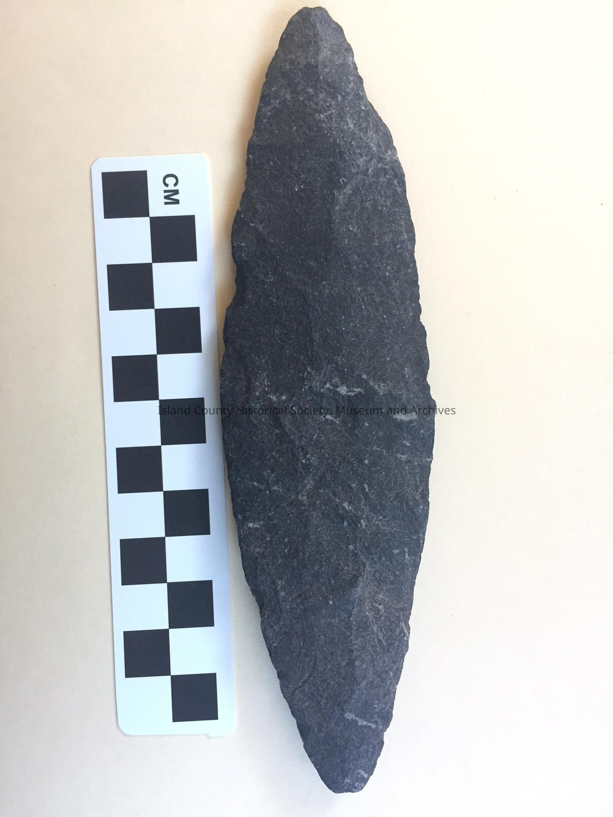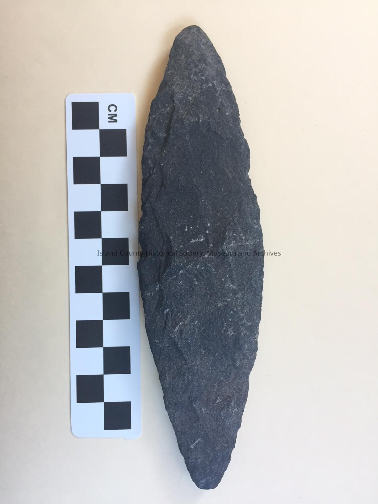 Point of dark grey rock, enlongated oval shape, worked on both sides.Lexicon