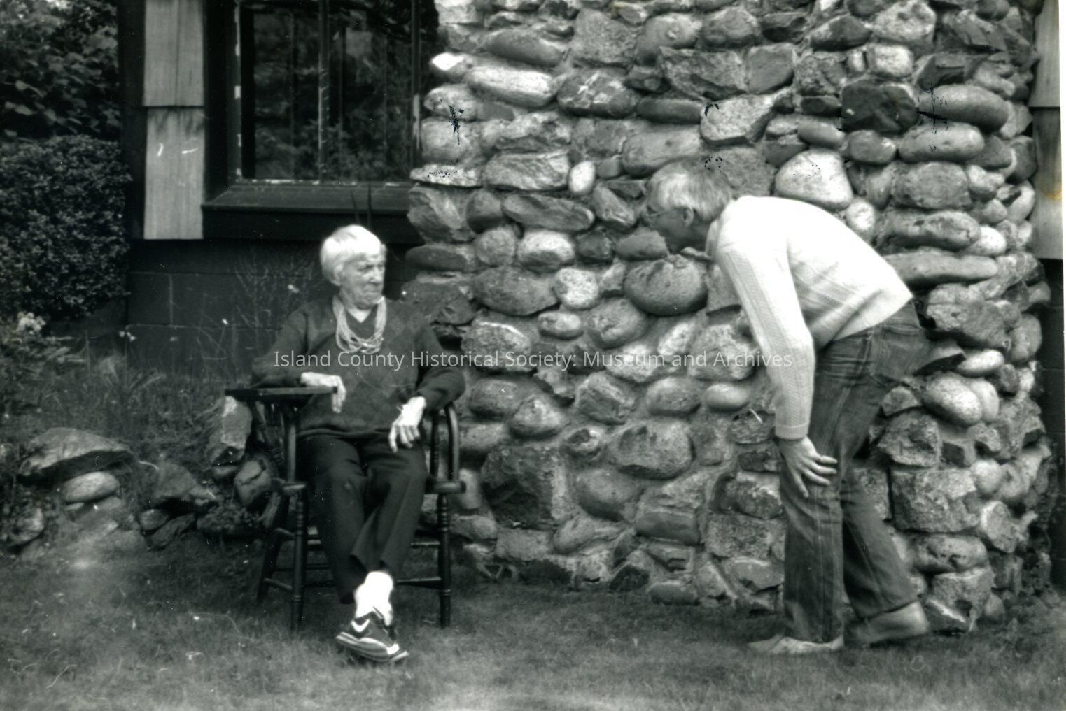 Black and white photo of a woman sitting on a chair outside next to a large stone chimney. The house has large windows in the background. This is the Fullington house. A man wearing jeans and a sweater is leaning forward talking to the woman who is wearting a sweater, trousers, sneakers and a necklace. On the back: