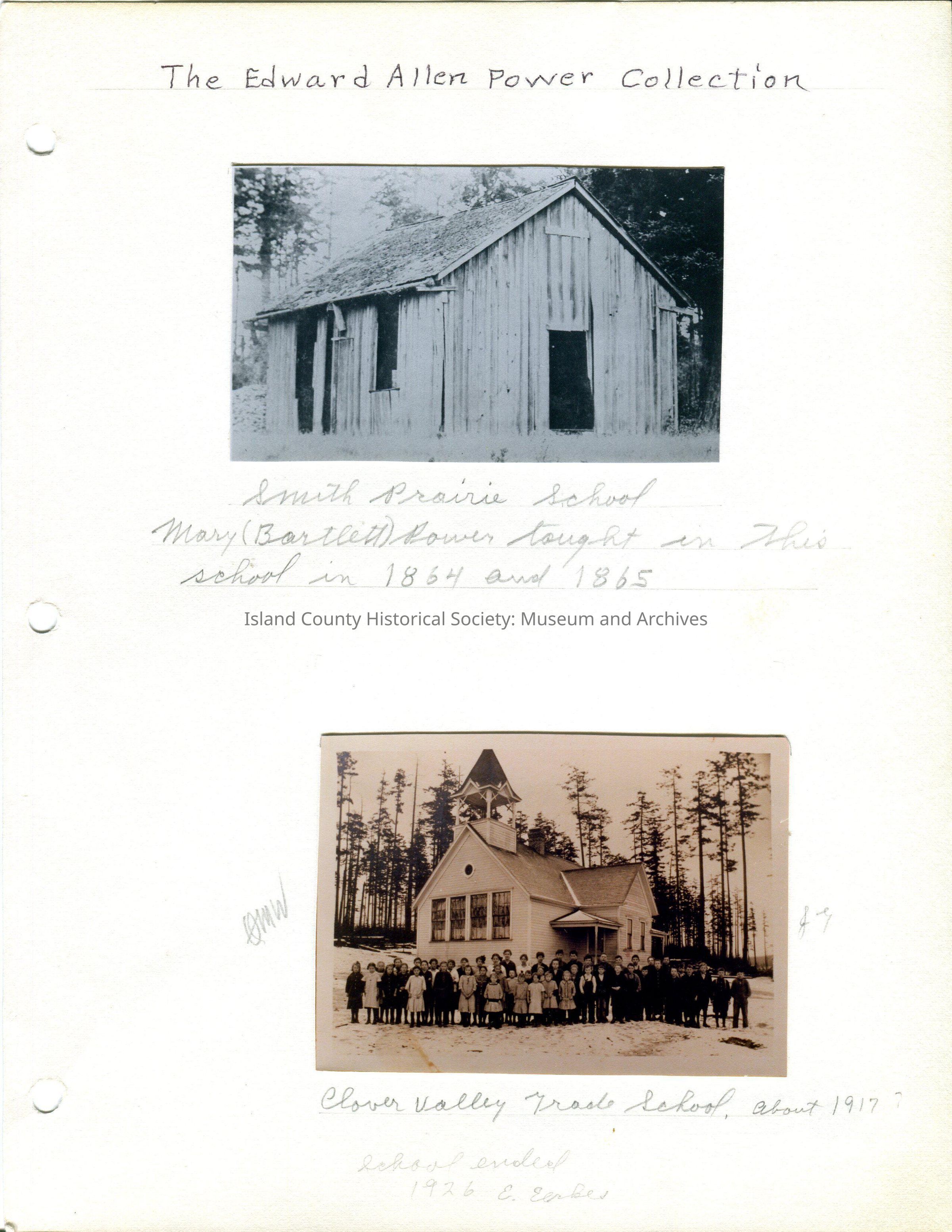 Top Photo - 4.5"W x 2.5"H - Photo of the Smith Prairie School in a dilapidated state. The doors and windows are missing and the roof is falling apart. The note below the photo says Mary Bartlett Power taught at the school in 1864 and 1865. No date.