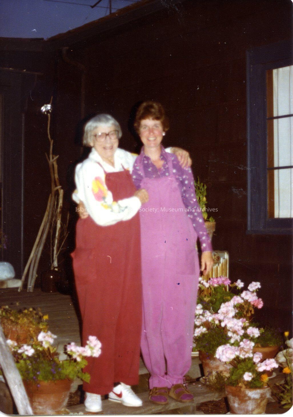 Color photo of two women standing close to each other - they are wearing overalls - one red, the other mauve. The woman in red is wearing a white shirt and white sneakers. She is wearing glasses. There are flowers in pots beside them. They are standing on a low porch outside a building. On the back: