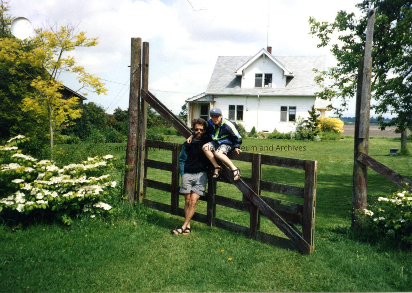 Color photo of a man and a boy. This photo is taken further away than the previous photo of the two. The boy is wearing a light blue billed cap, a blue jacket with green and white accents, blue shorts, sandals, and he is sitting on a split fence gate which is partially open. The man is standing beside him; he has a beard and his glasses are hanging around his neck. He has on a dark top with green collar and sleeves, is wearing shorts and sandals. A white house is in the background. Trees and bushes are in bloom.