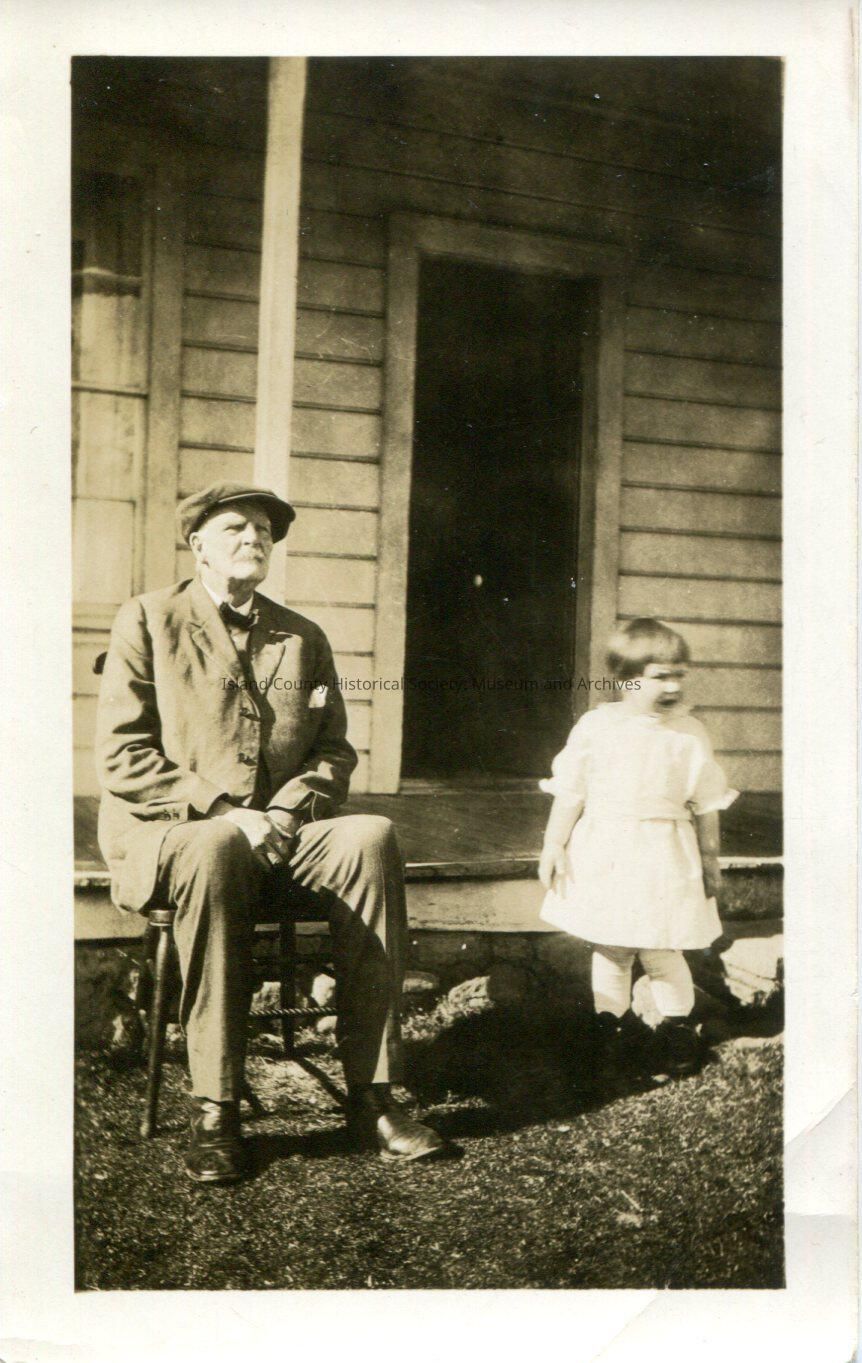 Black and white photo of Charles Terry and unnamed child. In the photo Mr. Terry is sitting in a chair in the front yard of a home. The home appears to have the front door open and has a thin beam behind Mr. Terry. Charles is wearing a suit and hat. The child has a short bwol cut and is wearing a dress with white leggings.