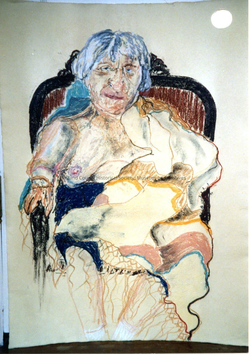 Color photo of a pastel of a woman sitting in a red covered chair, wearing a shawl with a fringe. On the back: pastel Painting of Mary Fullington by a friend of Drake Saladay's A hole was punched in the top left corner.
