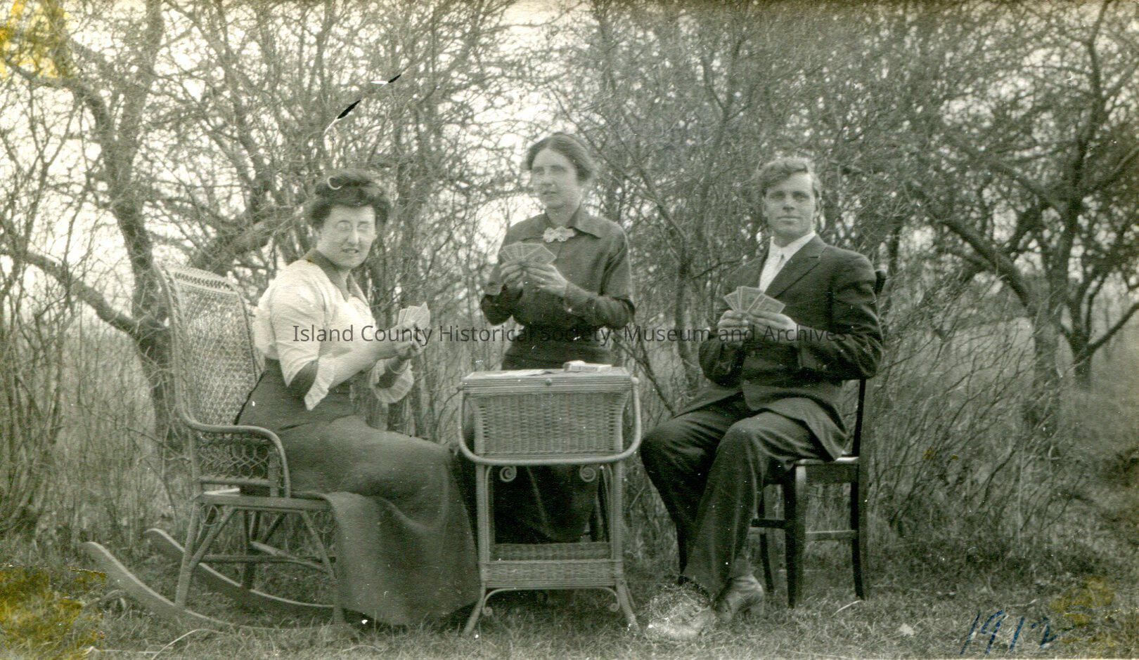 Black and white photo of Bulah Engle, Edie Tufts and Ben Tufts sitting at a table playing cards. On the back of the photo is written Part of the Pedro club. Mrs. Engle appears to be sitting in a wicker rocking chair and is looking directly at the camera. They are all dressed very well and in the background is a forest of trees.