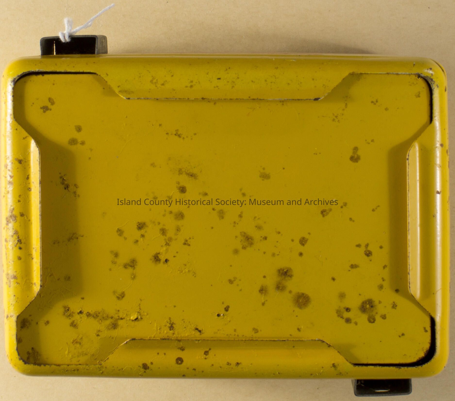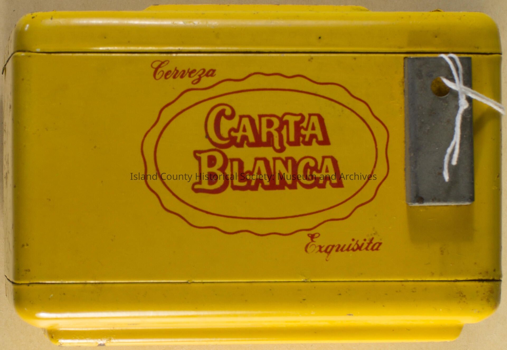 Metal can with yellow colored background and red letters stating: "Cerveza Carta Blanca, Exquisita". Napkin dispenser. Rust spots.