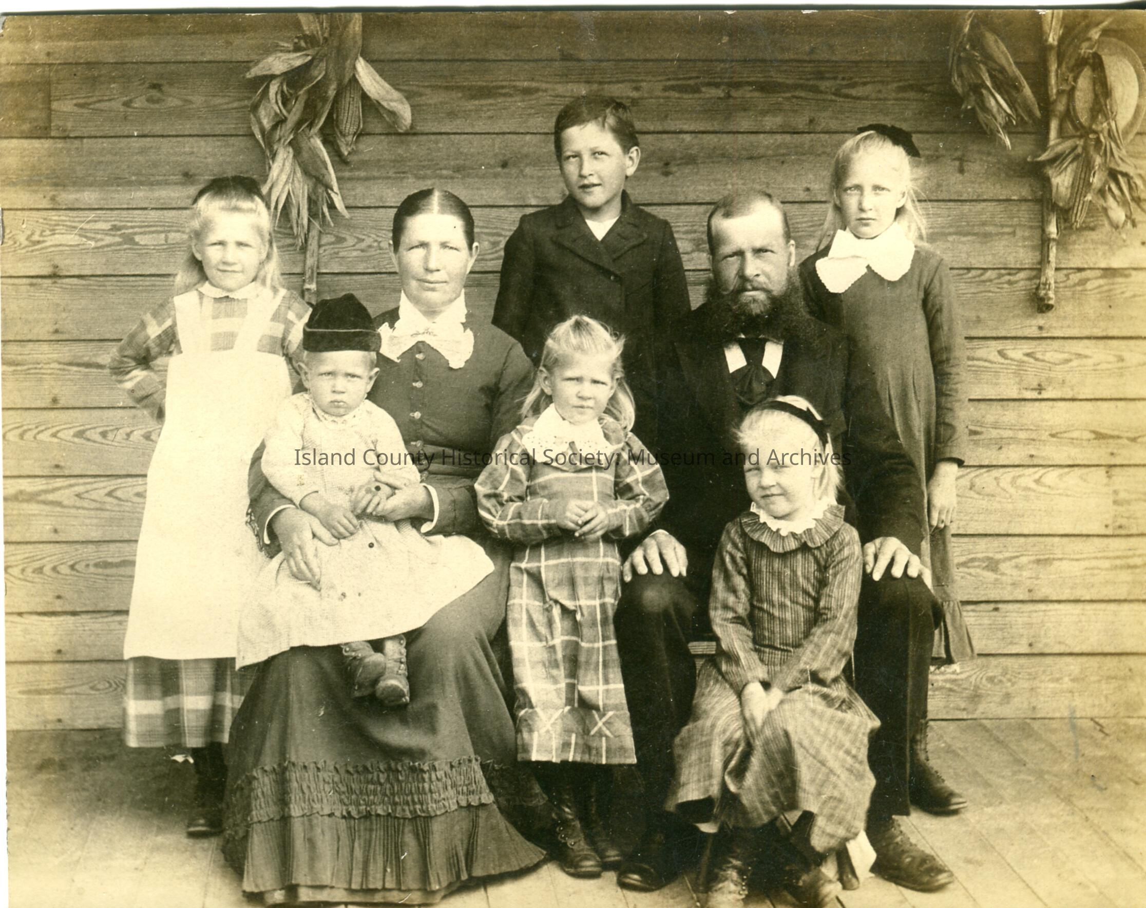 Photograph of group of a family: a man, woman, 4 girls and 2 boys. On the back: The Lenz family. They are seated or standing on a porch in front of a wood sided building. Two corn husk bundles are hanging on the building. The woman has a long dress with lace at the collar and a ruffle near the hem. Her hair is pulled straight back with a part. The man is wearing a dark suit and has a beard. The girl on the left is wearing a checked dress with pinafore, the girl in the center a checked dress with bow, the girl seated in front a striped dress and bow in her hair and the girl standing on the right a dress with large lace collar and a bow in her hair. The boy in back is wearing a dark coat and the baby/toddler is seated on the woman's lap and is wearing a baby gown and hat. The original photo is silver gelatin. Older lady is Louisa Lenz and her husband. The young boy between the parents is Charles Lenz. In Langley he owned Lenz Garage. It was near a bluff- there was so much room behind that they could play basketball. Currently the building is held up with pilings and the earth is only under half the building. The blonde girl on the right is Emma Lenz. That was Tiny's dad's mother (grandmother) who she never met. Fred Lenz is on the lap of Louisa.