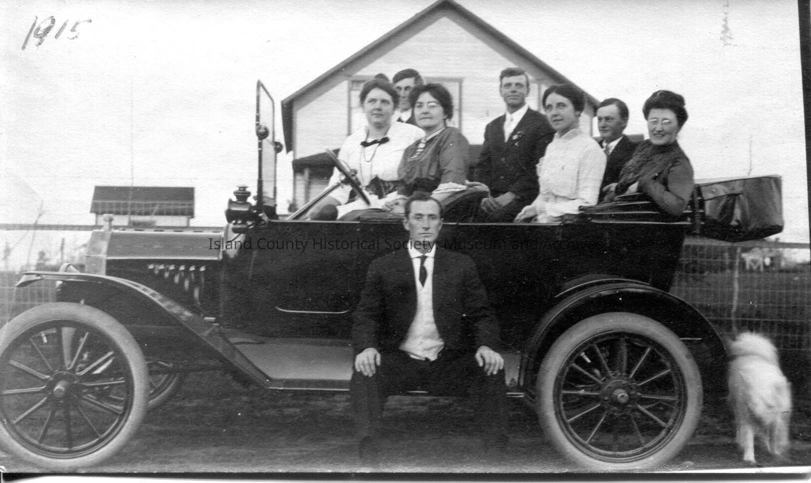 On the back of this picture is written: Justus' ford with the Pedro Club. Ralph Engle on side [of car] Backseat Beulah & Arthur, Edith & Ben, Justus & Ethel & Ruby and dog "Woppie." The car appears to be parked in front of someones's home.