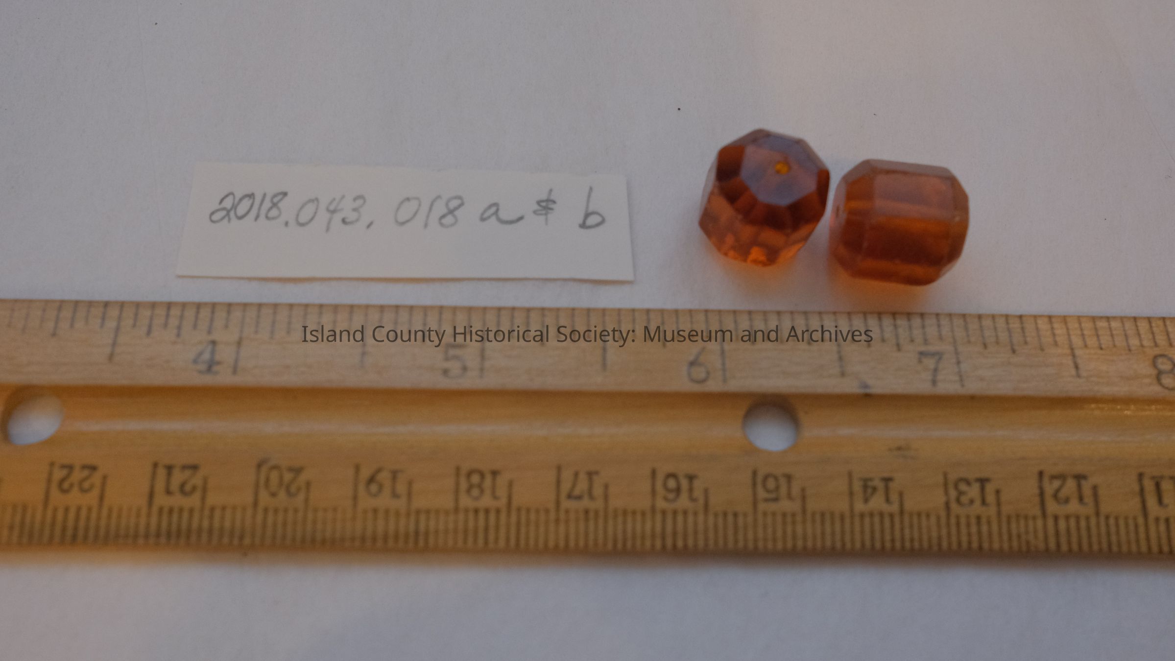 Two clear brown beads. They are long octagonals. Holes on the long ends (A+B). Note with the stone tools: EK Blatman Indigenous collection from Island County coast line.