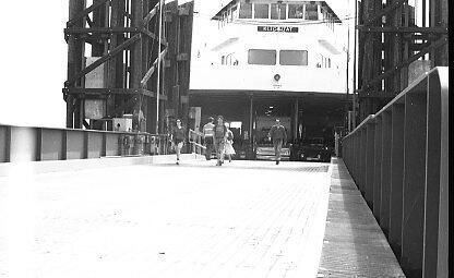 Men and women leaving the Klickitat ferry. Cars and trucks on ferry.Made/Created