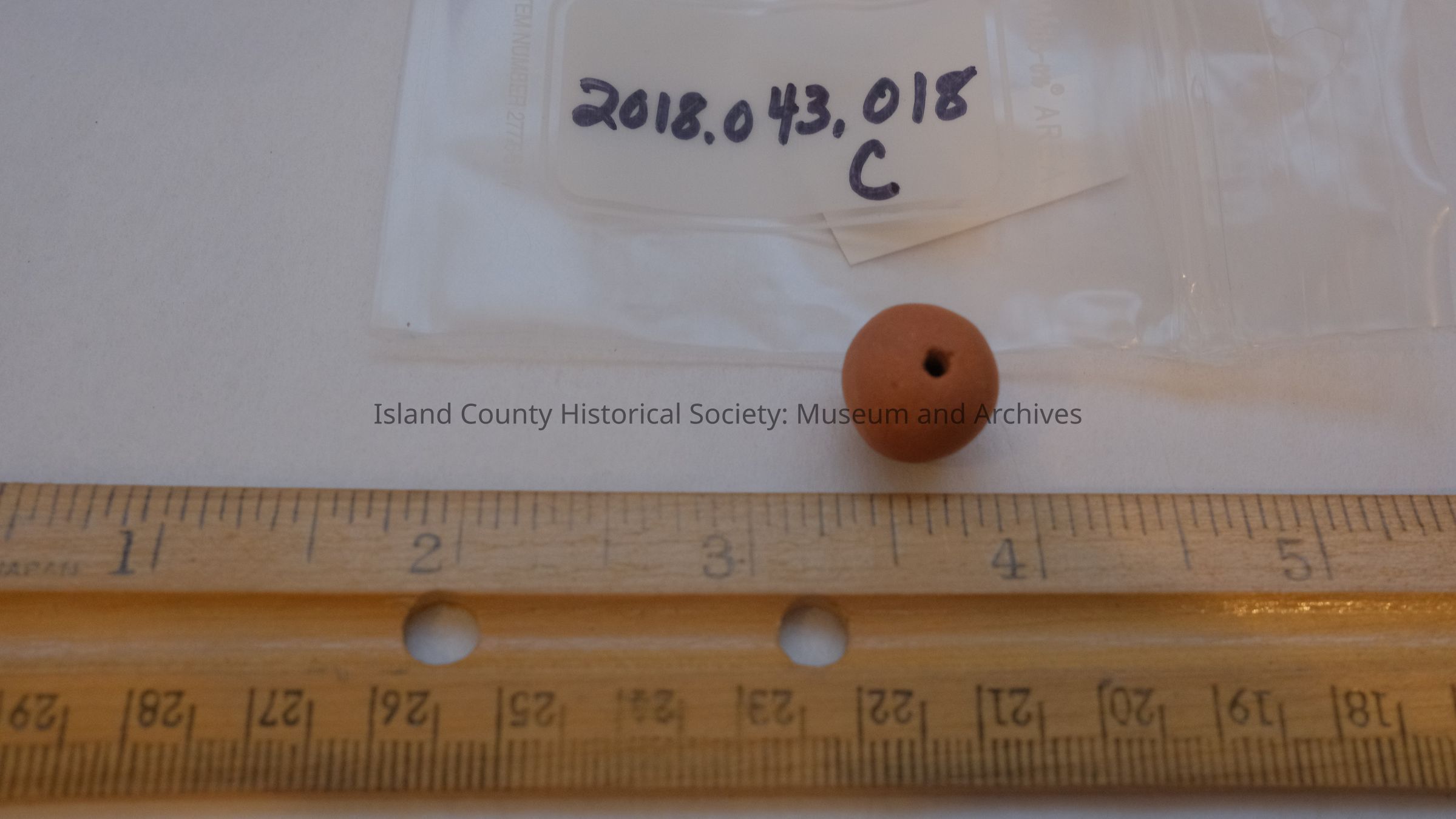 One claylike round bead with a hole filled with something on one side. The other side looks empty. Note with the stone tools: EK Blatman Indigenous collection from Island County coast line.