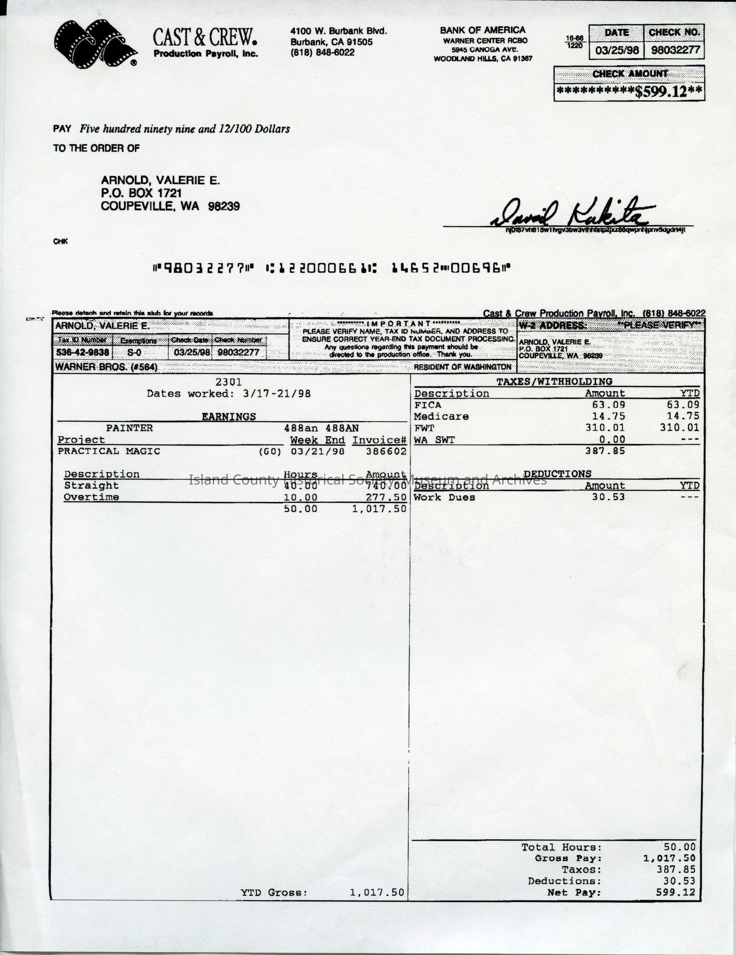 A paystub to Valerie Arnold for her work as a painter on the set of Practical Magic, filmed in Coupeville.