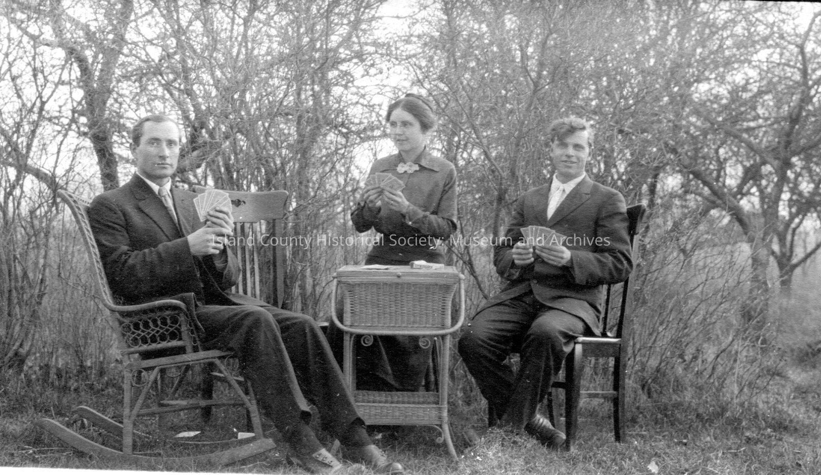 Black and white photo of Ralph Engle, Edie and Ben Tufts playing cards. Ralph Engle appears to be sitting in a wicker rocking chair and they are all dressed in their Sunday best. The table appears to be in a yard with a heavily forested background.