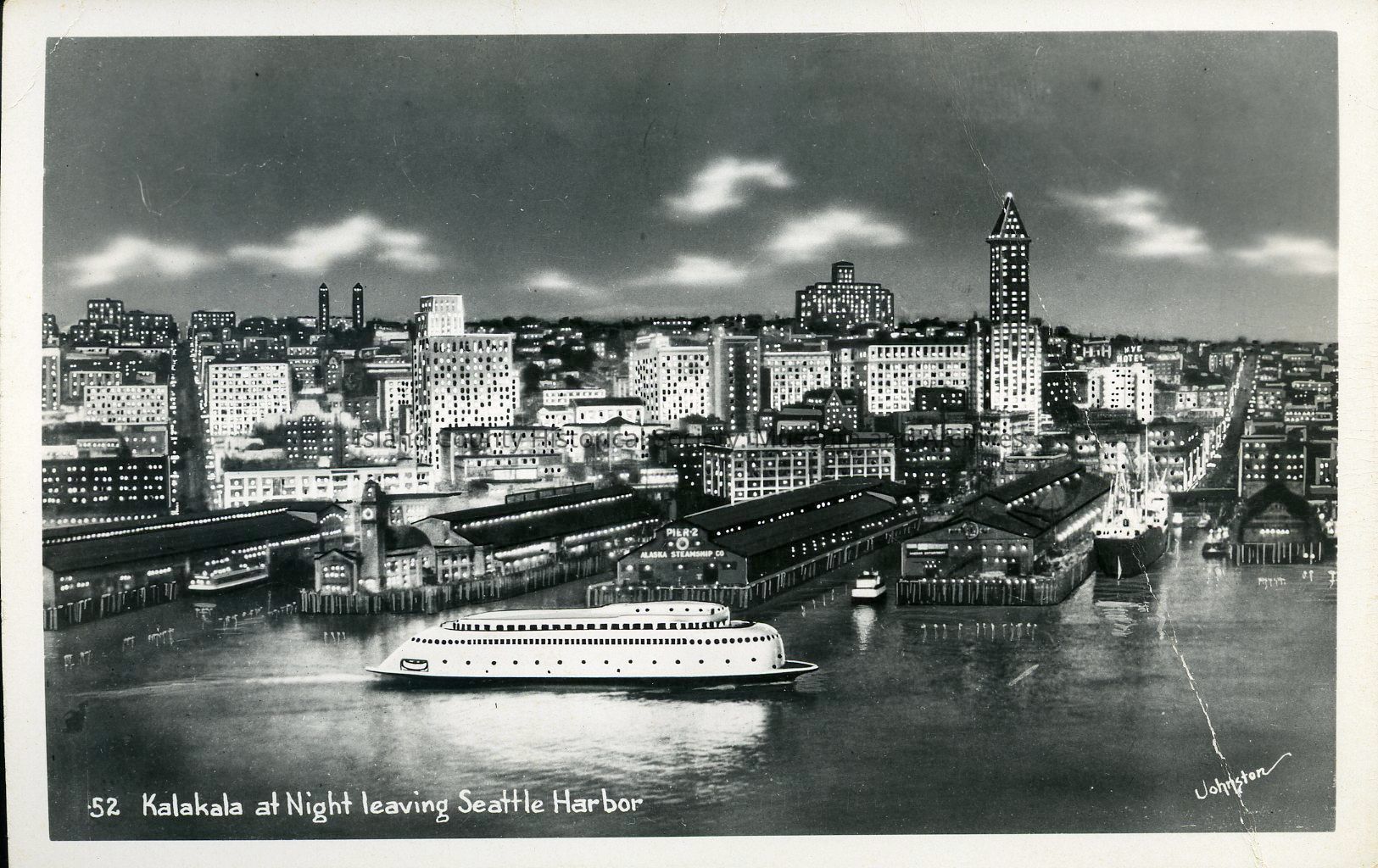 Postcard of Washington State Ferry "Kalakala at Night leaving Seattle Harbor".Collection