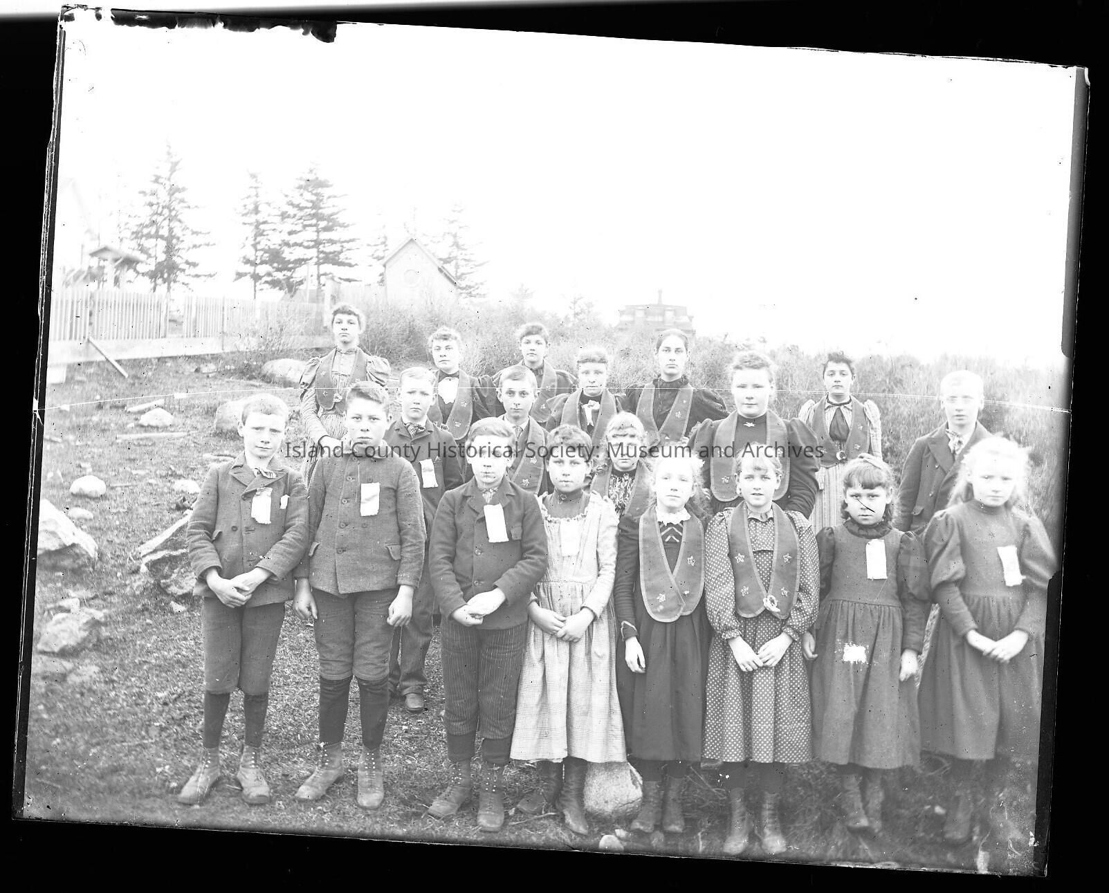 Photo of Coupeville women with boys and girls in a field - one of hte Lovejoy houses is in the background. Most of the women and girls are wearing a badge holder that has stars embroidered on them. The boys and some girls have a small rectangular piece of material (probably 2 inches x 4 inches) pinned to their jacket or dress; could be a prize.Made/Created